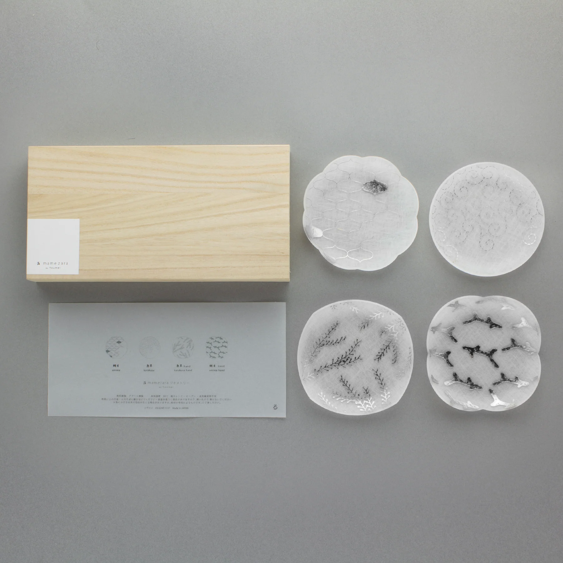 マット加工を施した和紙調アクリルの表面は、箔押しが美しく映えます。カラーは「ゴールド」と「シルバー」の2種類。シンプルで趣きのあるデザインは、それぞれ「網目(あみめ)」「唐草(からくさ)」「唐草hand(からくさハンド)」「網目hand(あみめはんど)」の4種類。