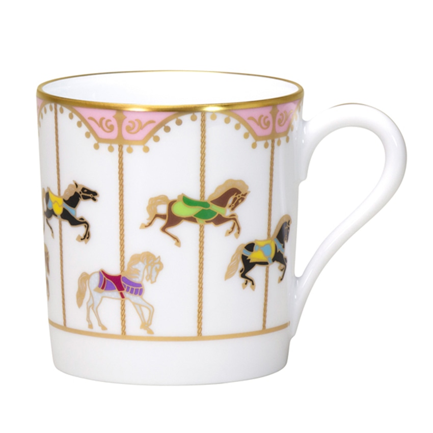 メリーゴーランドの中の9頭の木馬が、それぞれに異なる表情を見せて楽しく飛び回る様を、色とりどりの上絵と金彩により表現しています。