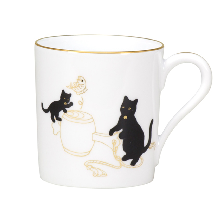 『黒猫親子』-縁起物語-マグ 『打ち出の小槌』 黒猫親子のやわらかで愛嬌のあるしぐさと、心温まるシーンを表現したマグカップです。
