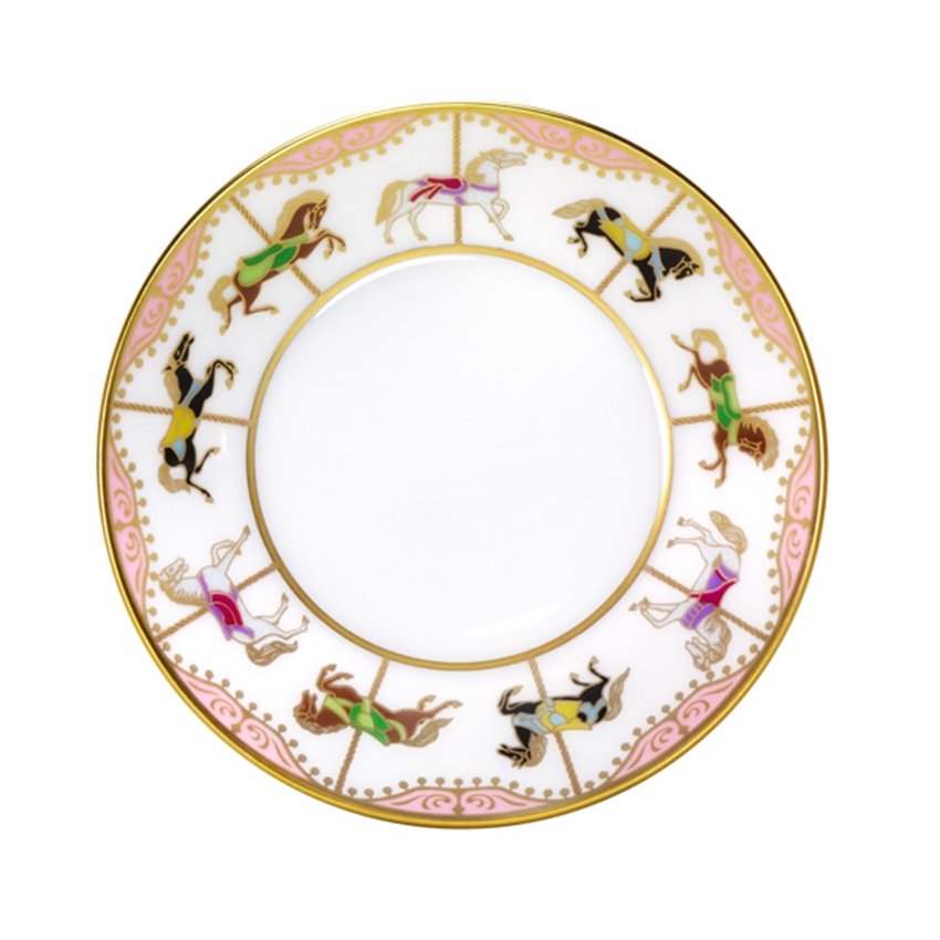 メリーゴーランドの中の9頭の木馬が、それぞれに異なる表情を見せて楽しく飛び回る様を、色とりどりの上絵と金彩により表現しています。