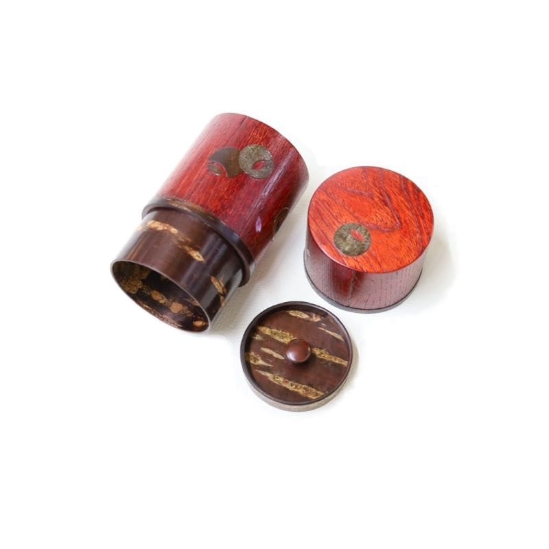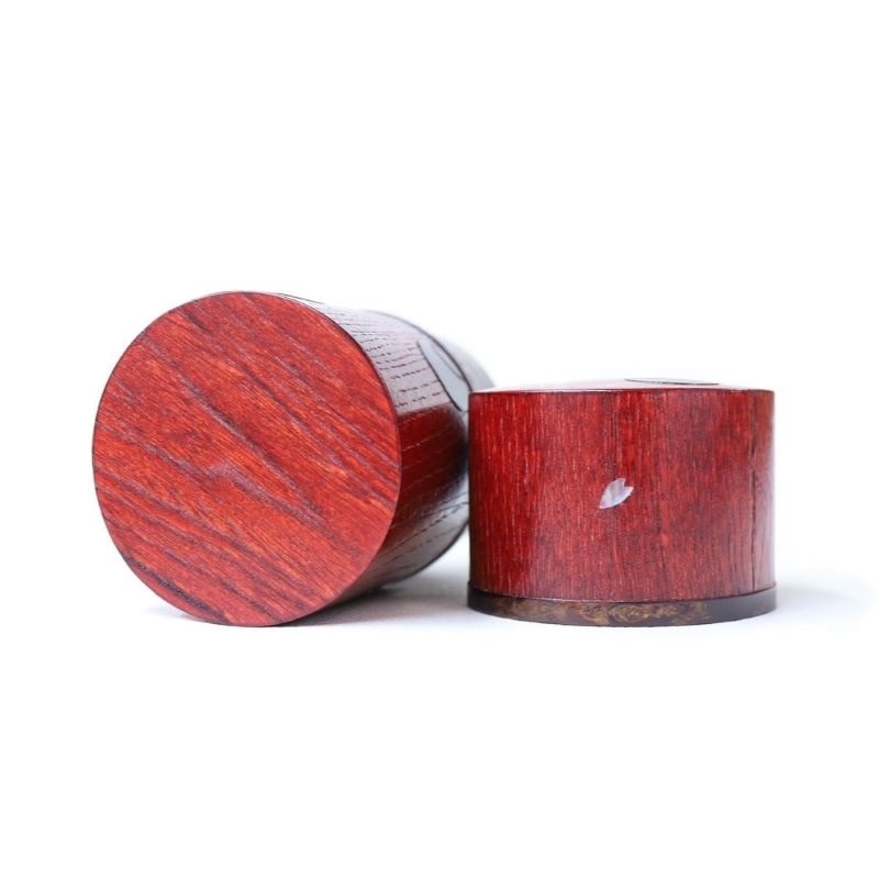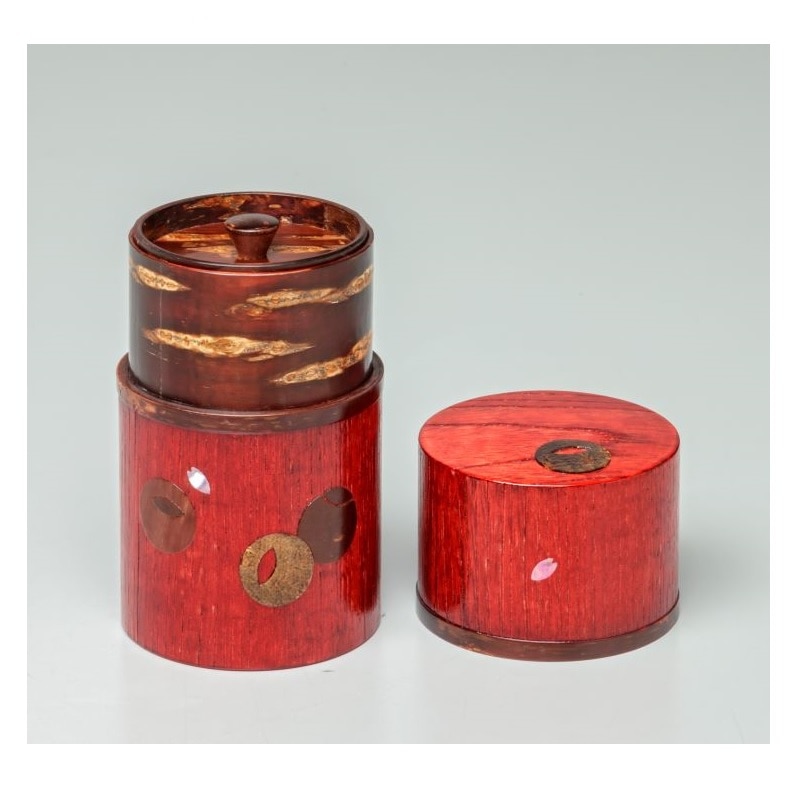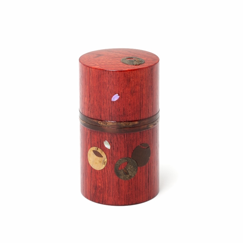 藤木伝四郎商店オリジナルの茶筒。外筒に裏千家の「つぼつぼ紋」とラデンの花びらをあしらいました。細型の茶筒は女性の手に馴染む丁度良いサイズ感です。