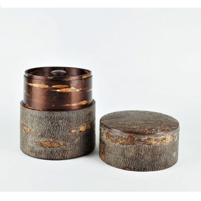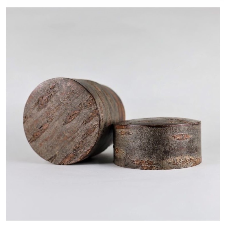 外筒には山桜の樹皮の表情をそのまま活かした霜降皮を使用しており、桜皮の節の凹凸など、素の風合いに触れていただけます。日々、使い込むほどに落ち着いた色味に変化していきます。