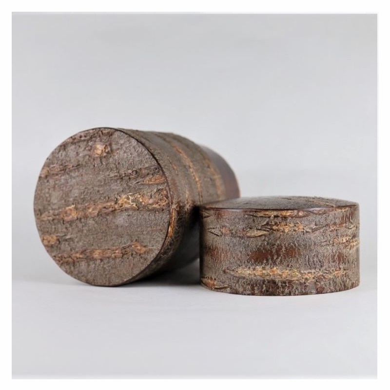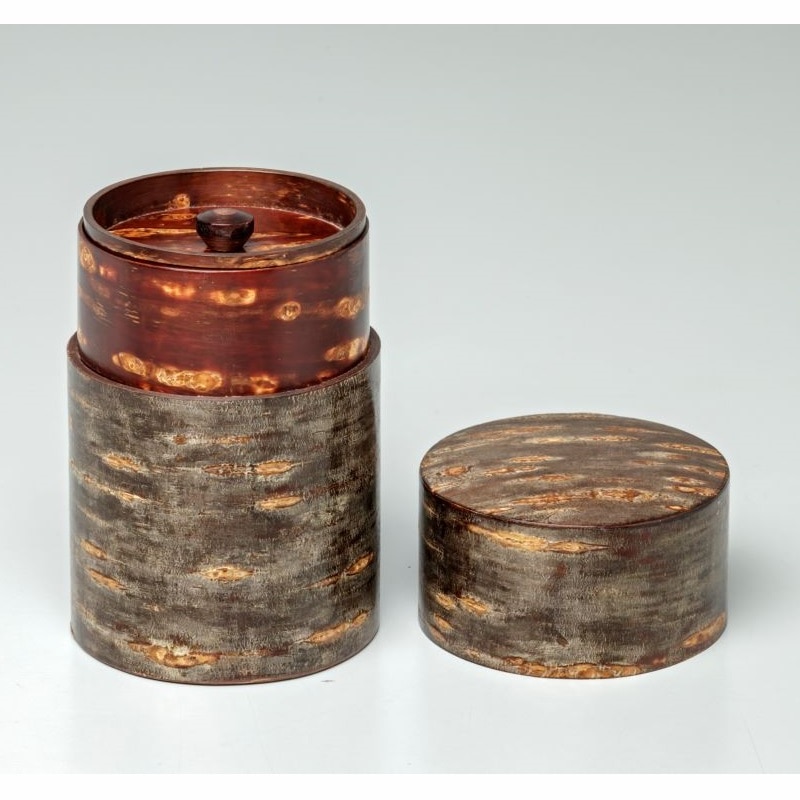外筒には山桜の樹皮の表情をそのまま活かした霜降皮を使用しており、桜皮の節の凹凸など、素の風合いに触れていただけます。日々、使い込むほどに落ち着いた色味に変化していきます。