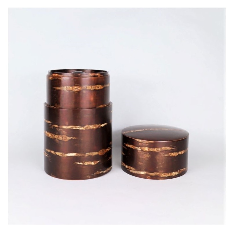 外筒には山桜の樹皮の表面を研磨した無地皮を使用しており、研磨されると現れる桜皮の節の独特の表情をお楽しみいただけます。日々、手沢によって光沢が増し、使い込むほどに落ち着いた色味に変化していきます。