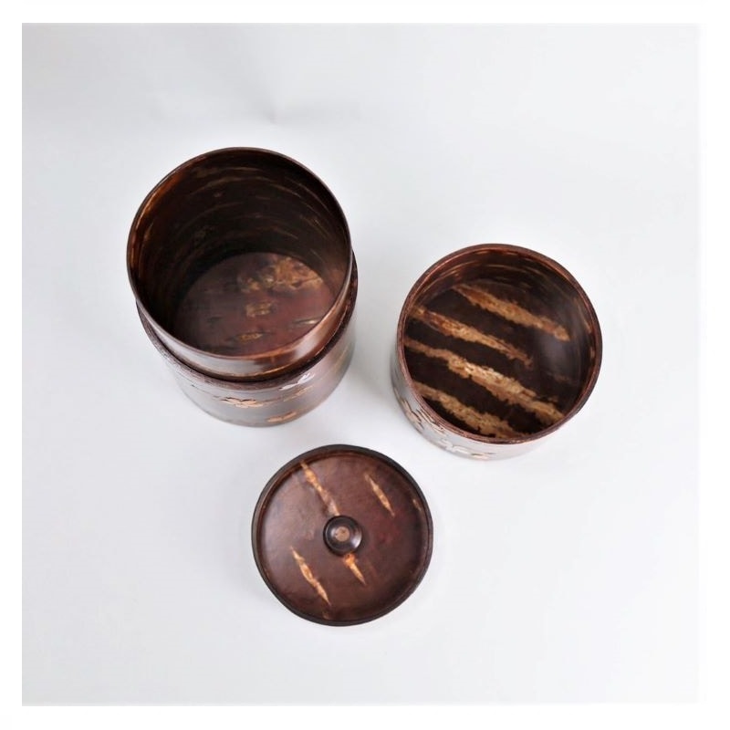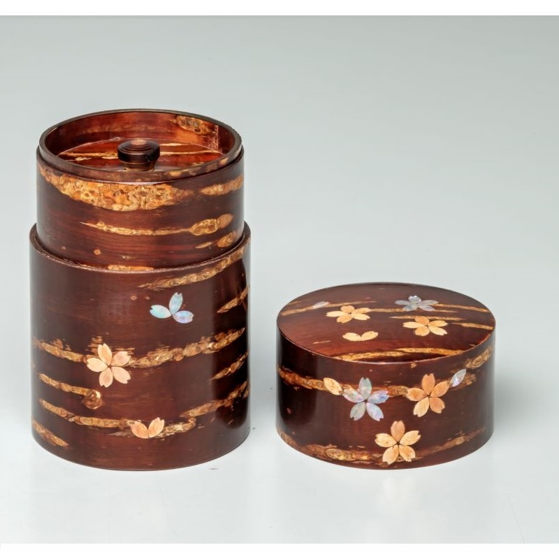 藤木伝四郎商店のスタンダードな茶筒「総皮茶筒 無地皮」に、桜の花びらが舞い散る情景を桜皮と螺鈿(らでん)の装飾で表現した茶筒。日々、手沢によって光沢が増し、使い込むほどに落ち着いた色味に変化していきます。