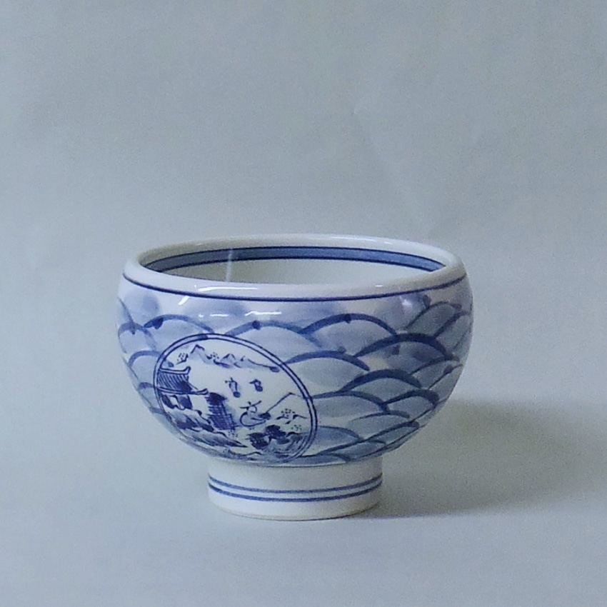 丸い小窓部分はハンコ・山並みは手描きとダミで染付られた職人の手仕事の詰まったうつわ。高台丼はかつて身分の高い人しか使えなかった形状で、日本伝統の形を現代に引き継ぐどんぶりです。いくら丼や海鮮丼など品よく盛り付けられます。