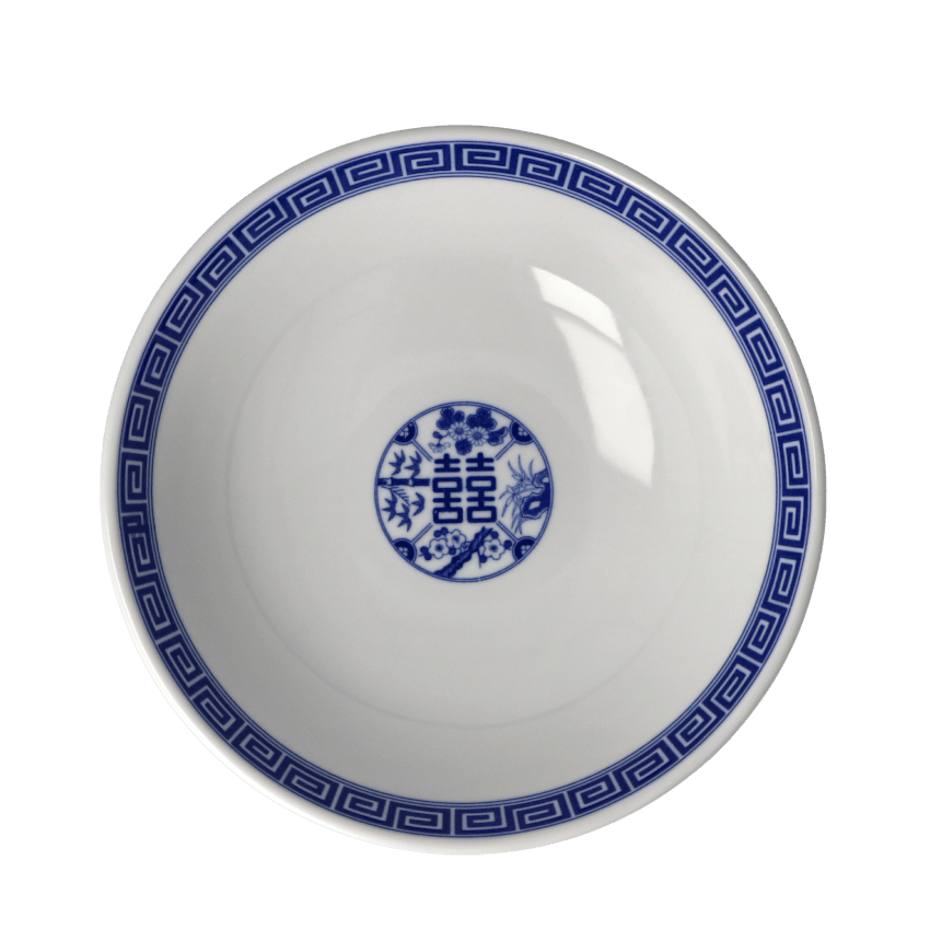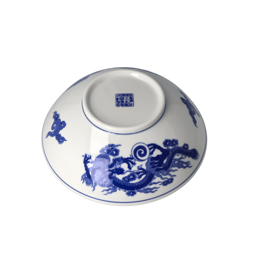 混ぜそばや冷やし中華に嬉しい浅型仕様の中華丼。内側の双喜紋・雷紋、外側の雲龍は職人による手張です。