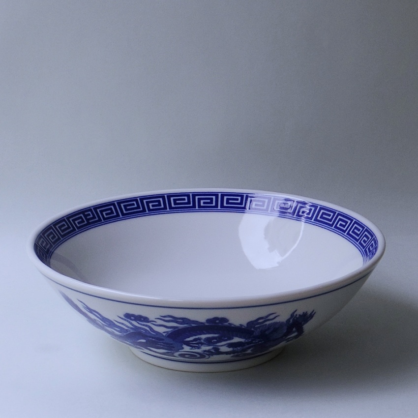 混ぜそばや冷やし中華に嬉しい浅型仕様の中華丼。内側の双喜紋・雷紋、外側の雲龍は職人による手張です。