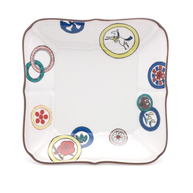 様々なモチーフの丸紋をシャボン玉のように散らしている楽しい文様です。 丸紋を描いたリム部分が額縁のように料理を引き立てます。いろいろな器との相性もよく、使いやすい器です。