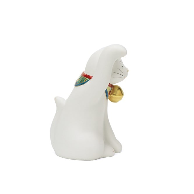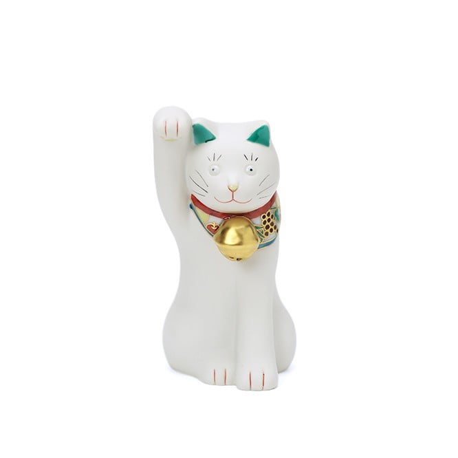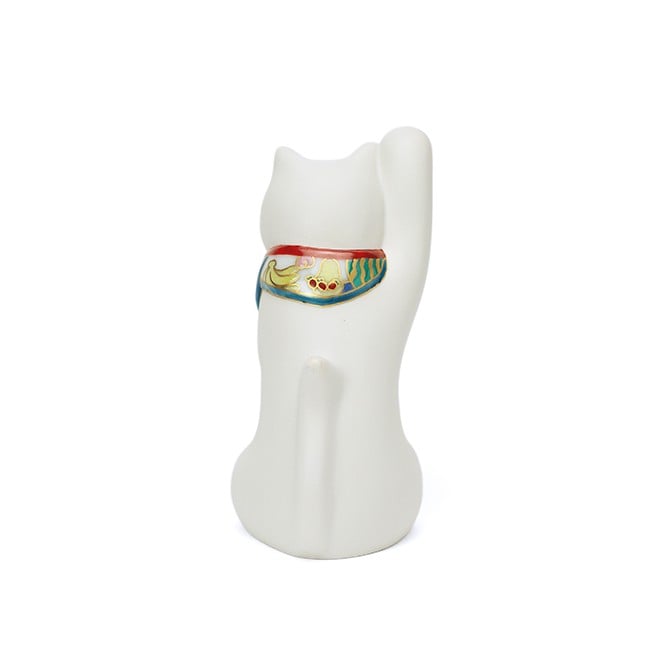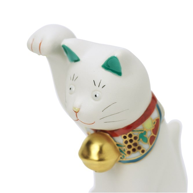 上出長右衛門窯のオリジナル招猫です。鈴もすべて九谷焼で出来ています。釉薬をかけずに焼いたボディと、振ると実際にカラカラと音が鳴る大きな鈴が特徴です。 昔から右手を挙げているのは金運、左手は人(客)を招くと言われています。本品は金運を招く右手をあげています。 絵柄はトロピカルなフルーツ柄で「瑞々しさ」を現しています。