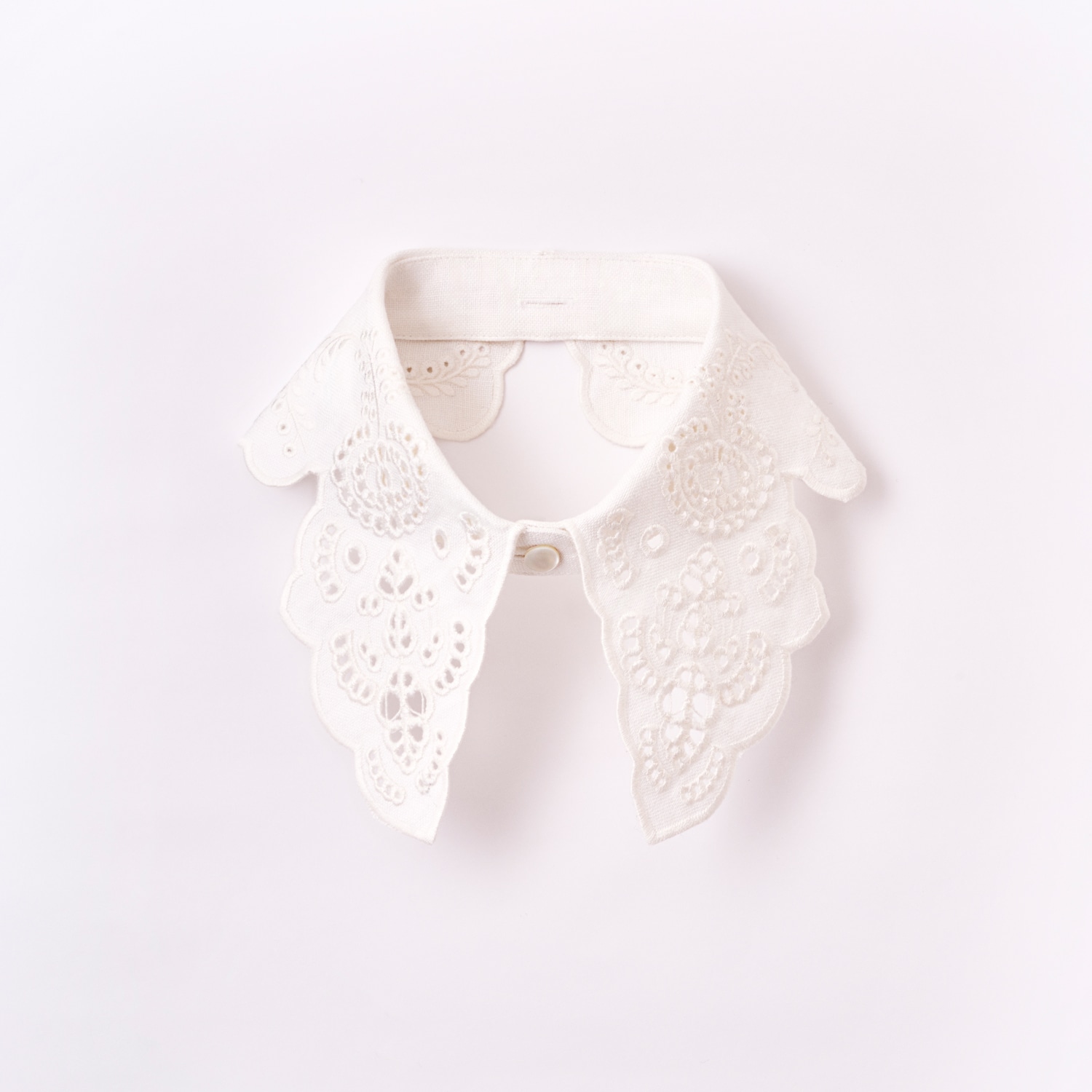 デザイナーがデッサンした花をモチーフにし、繊細な刺繍を得意とする群馬県桐生市で作成したリネンの付衿。どことなくヴィンテージのハンカチーフを思わせる襟はボーラー刺繍という技術で仕上げています。少し大きめの襟ですが、甘くなりすぎず大人の女性にも取り入れやすいようサイズ感を意識したデザイン。存在感のあるデザインなので、「衿足し」する事でシンプルなお洋服も一気にお出かけモードに。カジュアルにもエレガントにも使いやすいアイテムです。日々のコーディネートはもちろんの事、出張や旅行のお供にお持ちいただくとビジネスや食事、観劇など様々なシーンで活躍します。