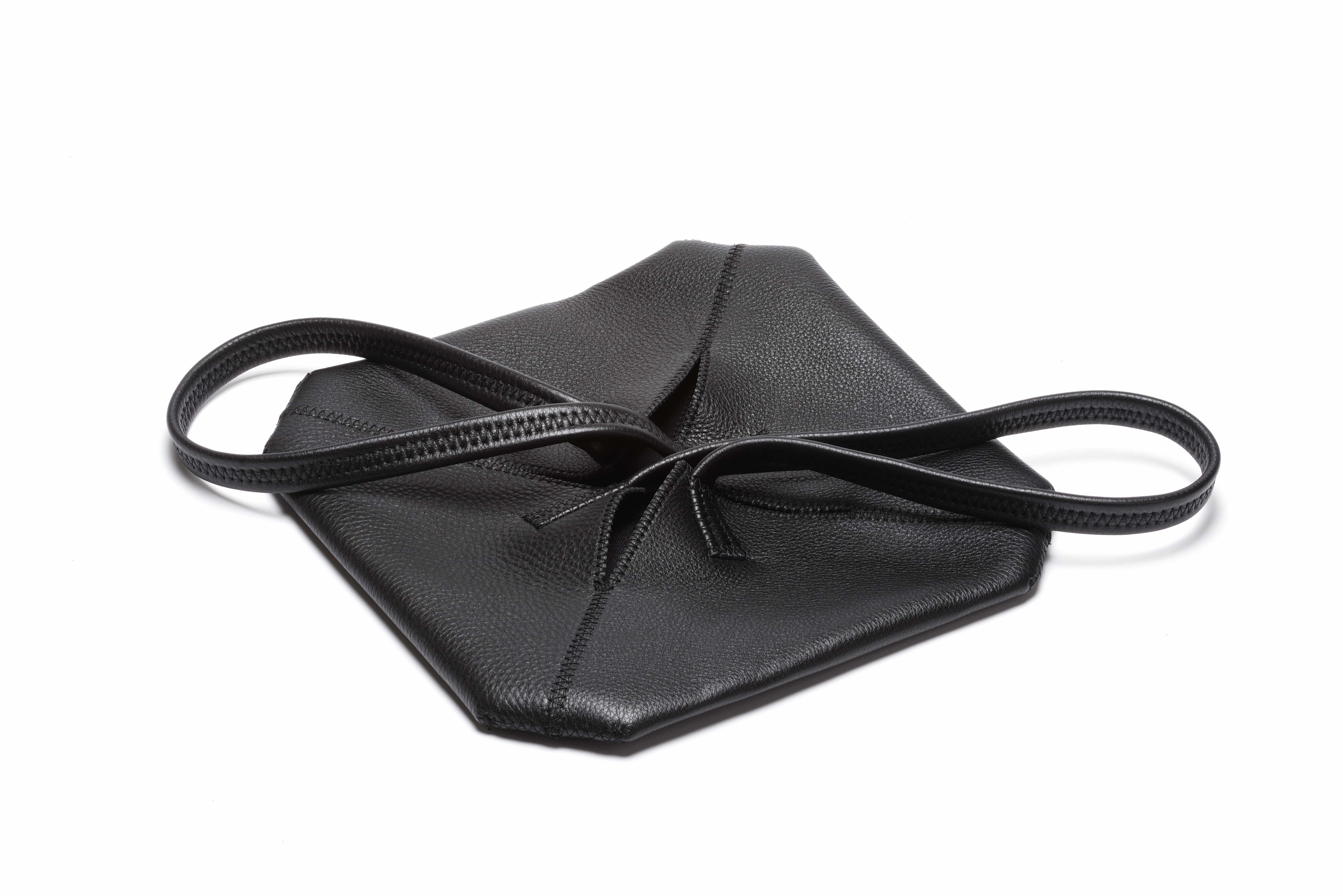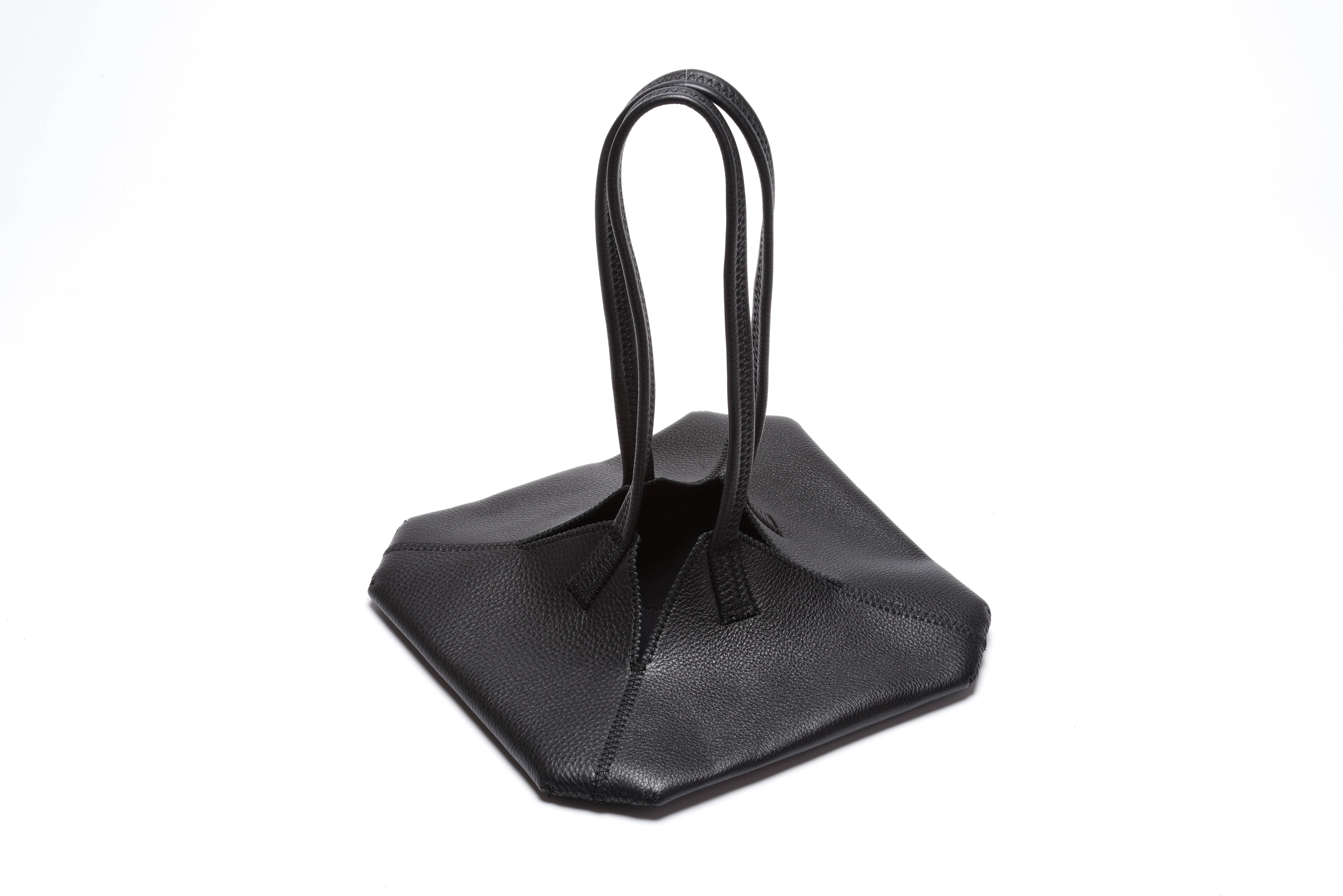 長財布とスマホを入れてランチタイムやワンマイル用に使用することを想定した、畳むと真っ平らで使用時は立体的なシルエットが特徴的な小さなトートバッグです。