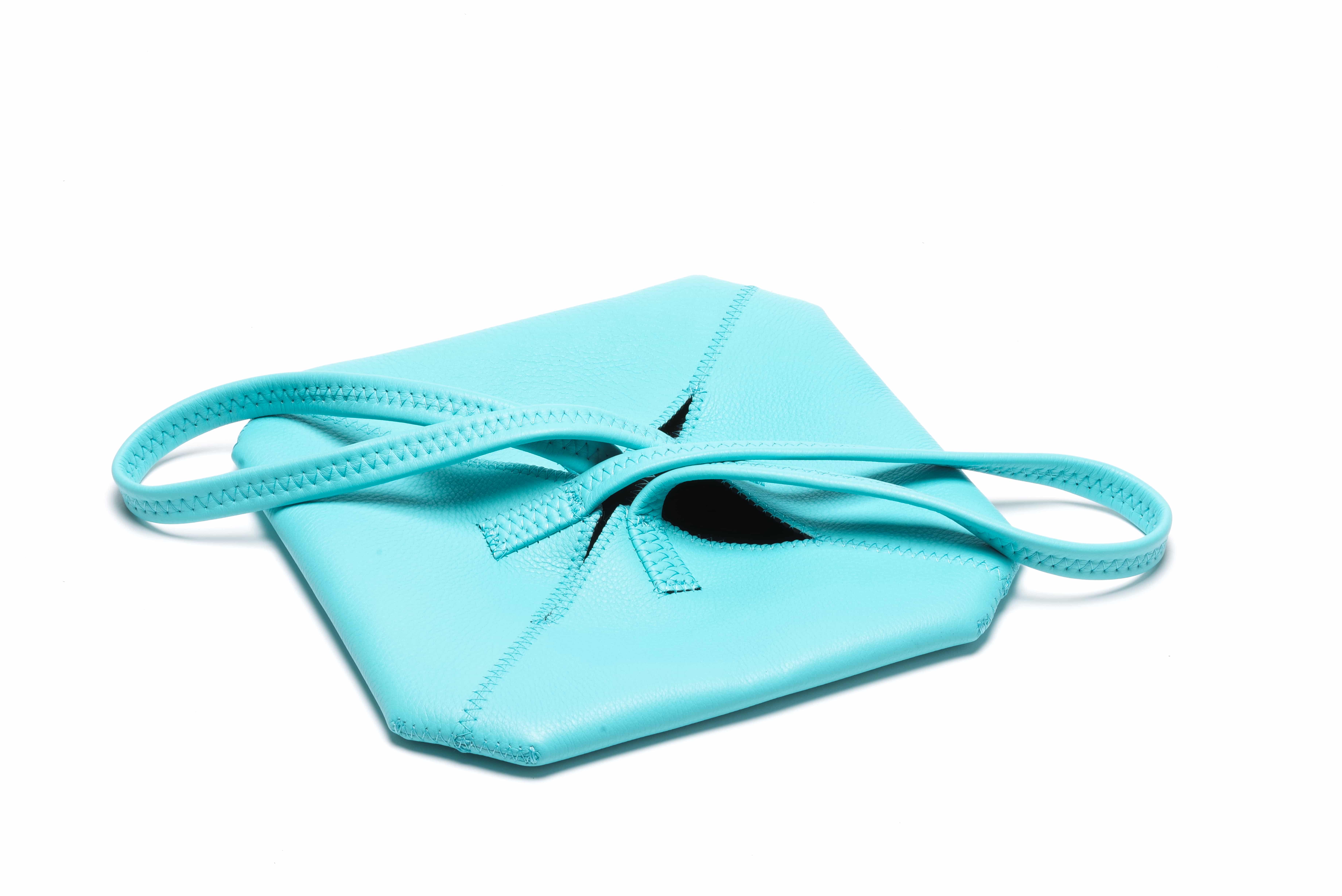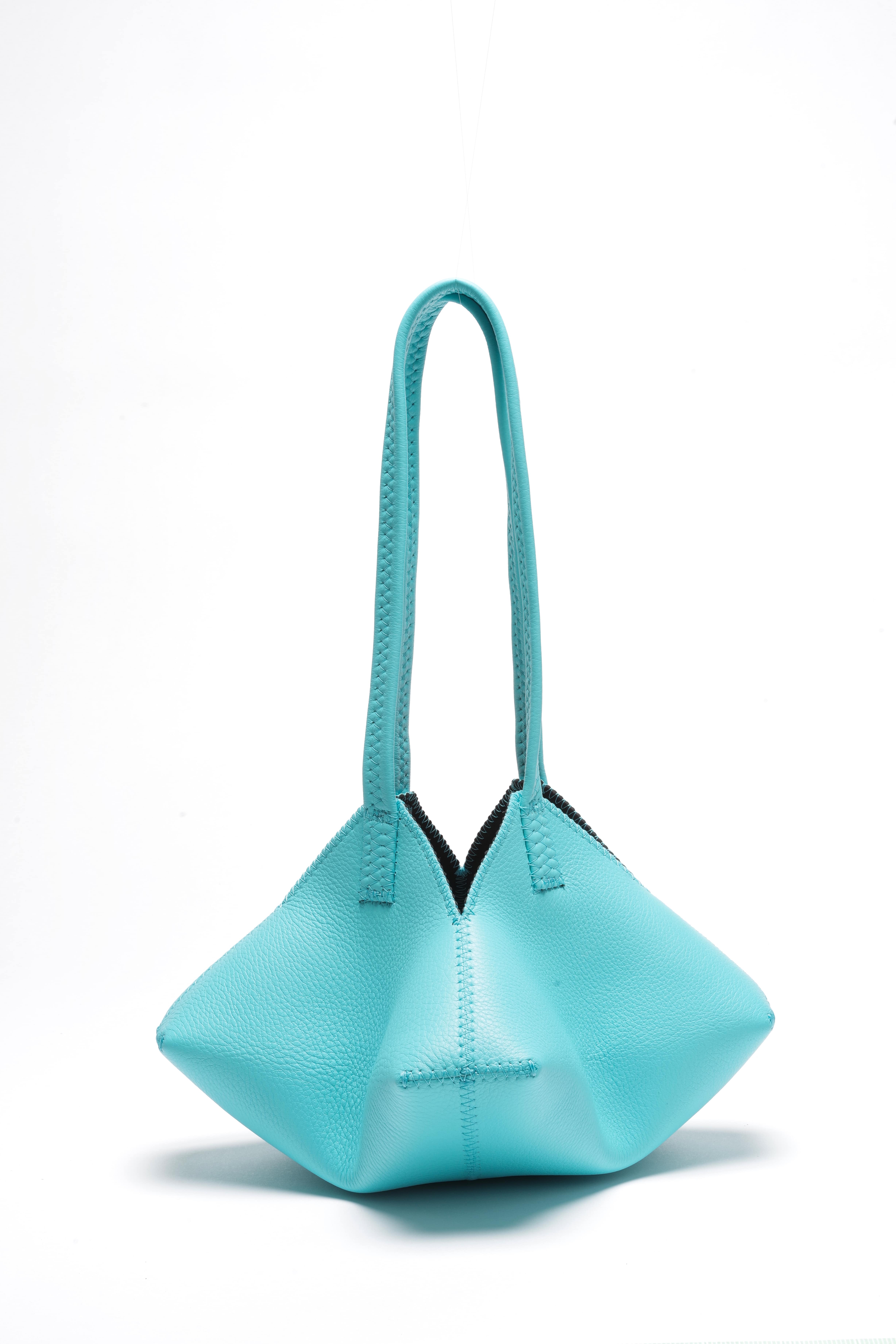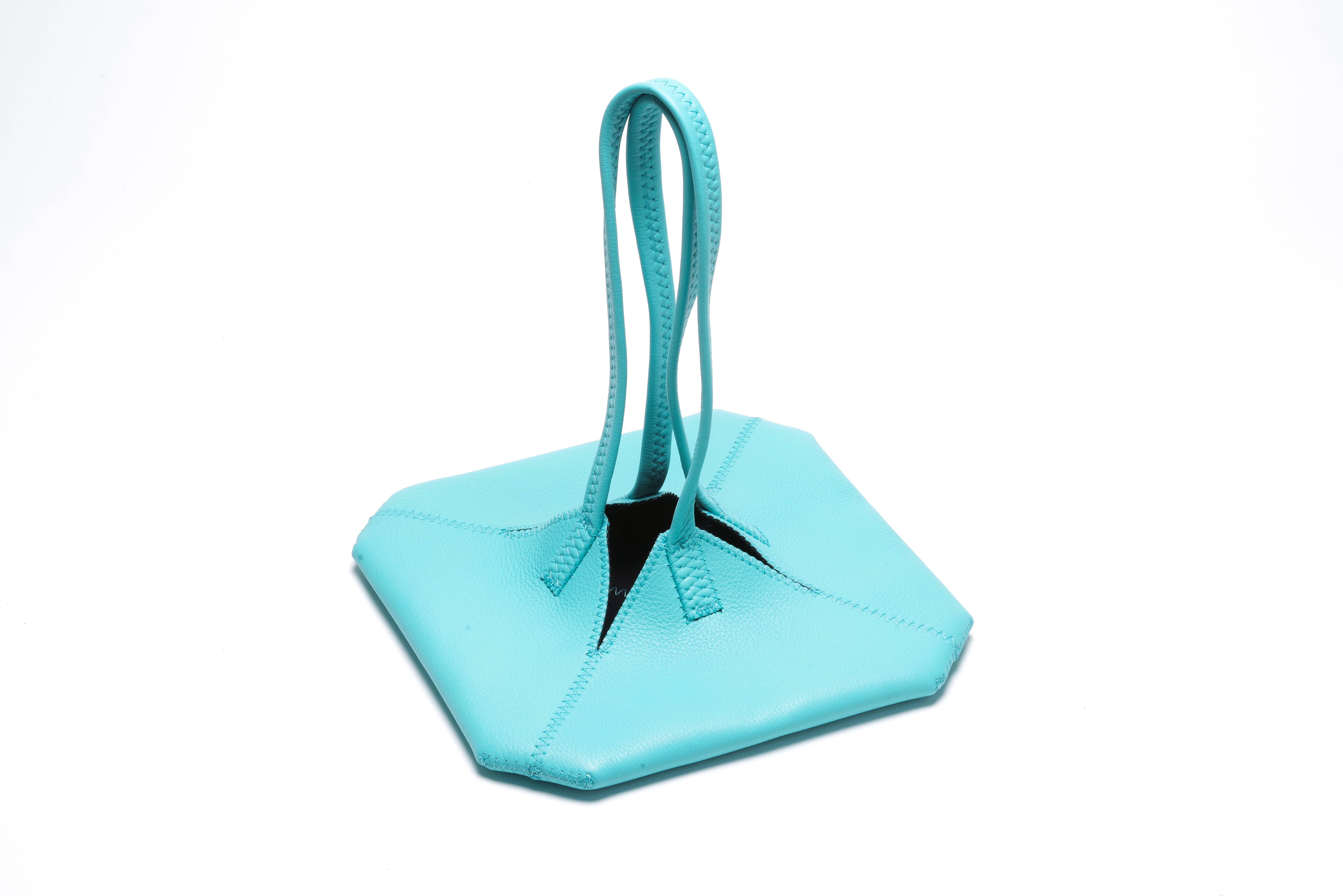 長財布とスマホを入れてランチタイムやワンマイル用に使用することを想定した、畳むと真っ平らで使用時は立体的なシルエットが特徴的な小さなトートバッグです。