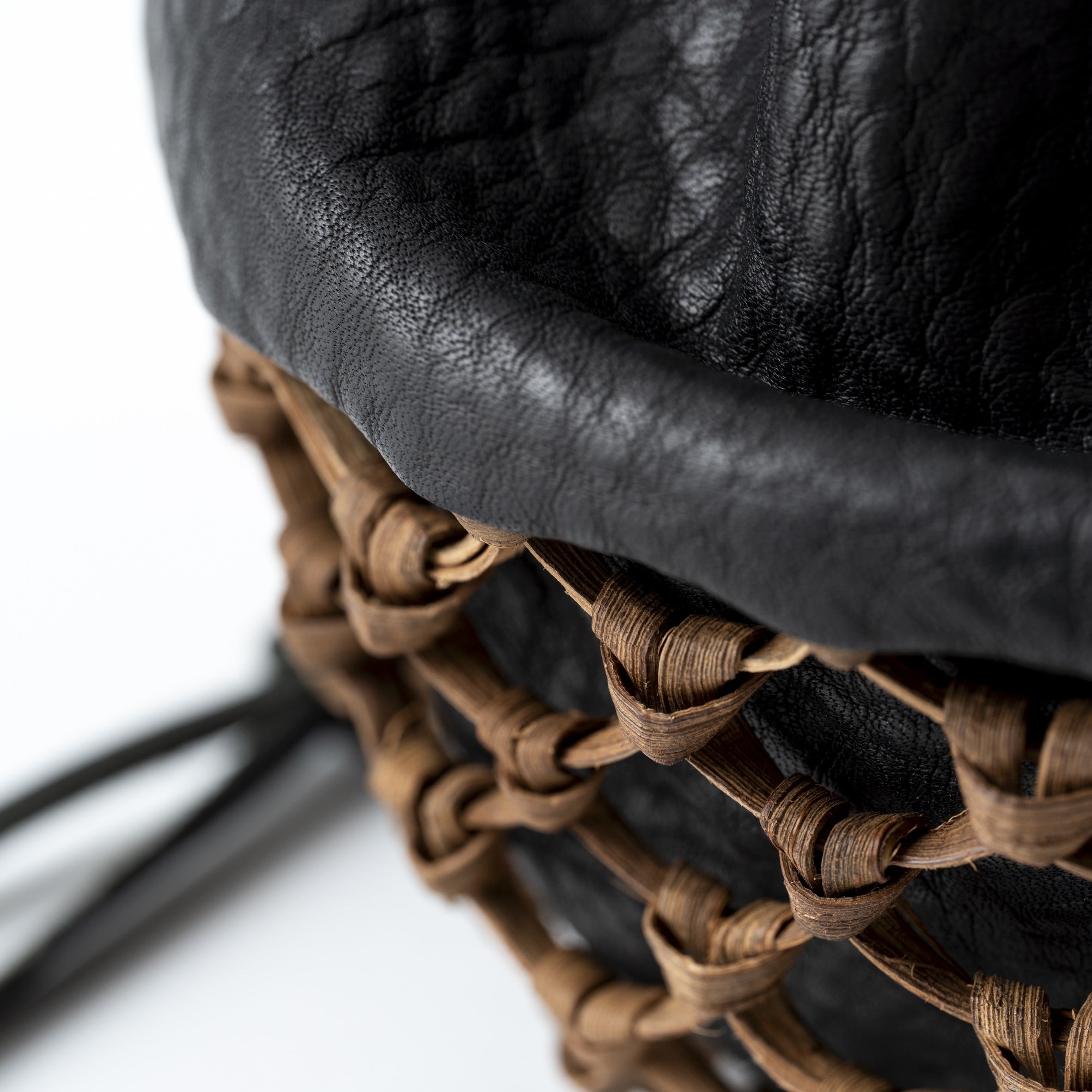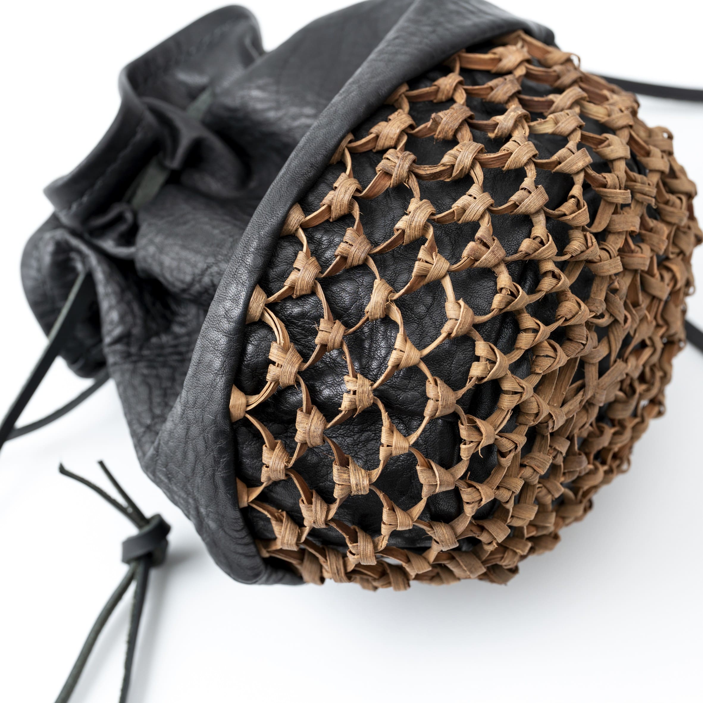 栃木レザー(牛皮)で作った巾着と山葡萄の樹皮のうろこあみをあわせた巾着型のバックです。紐の長さを調整して手持ちも肩掛けも可能です。