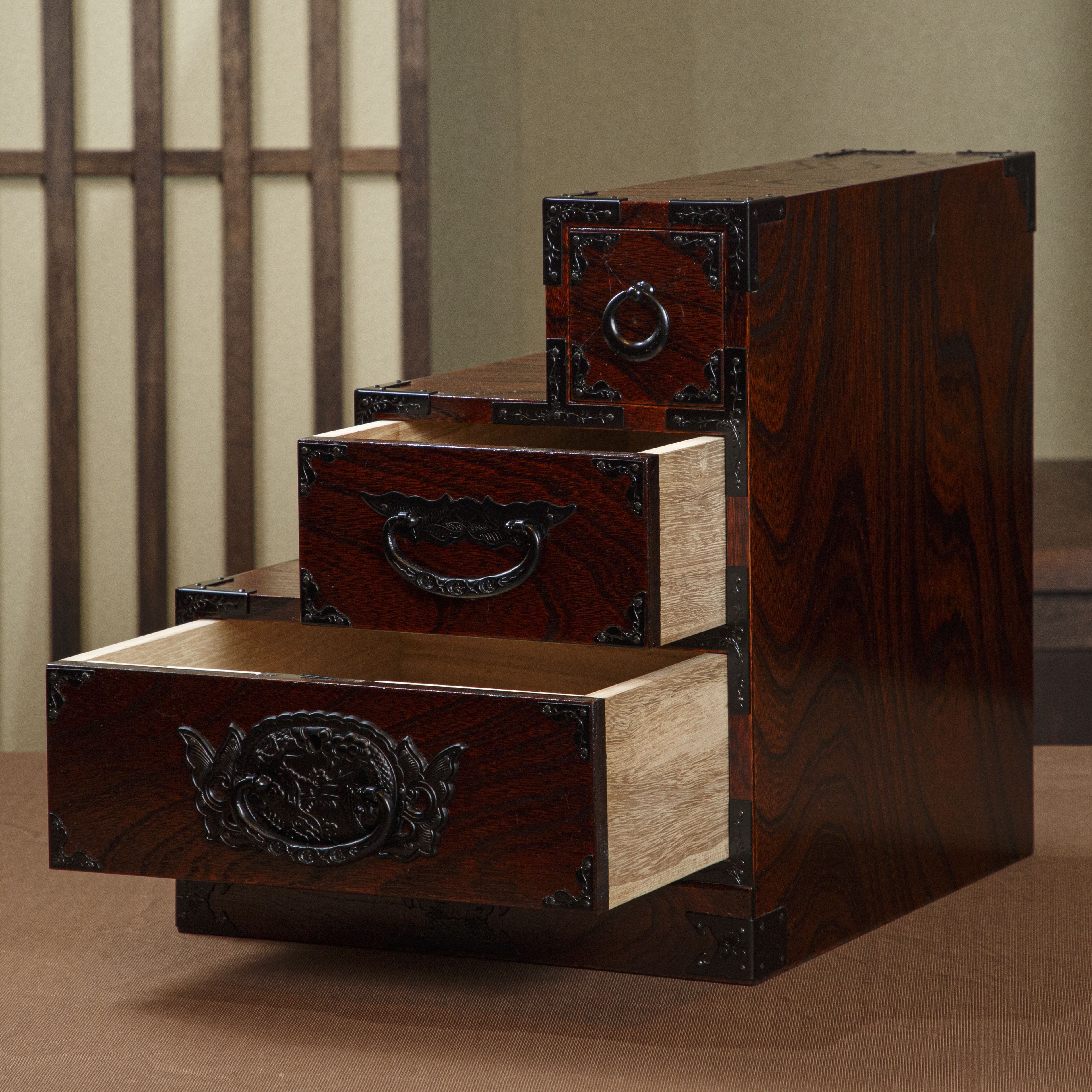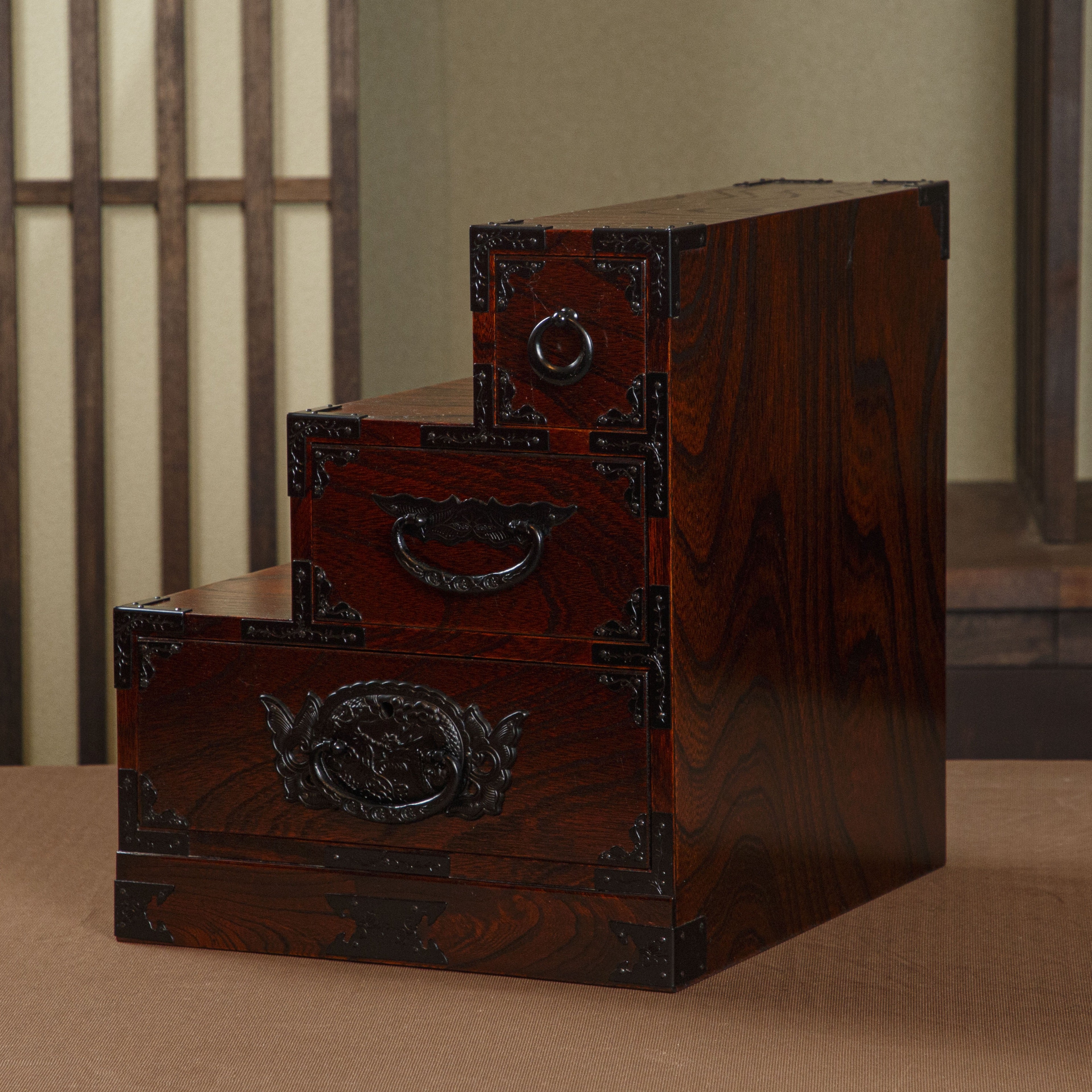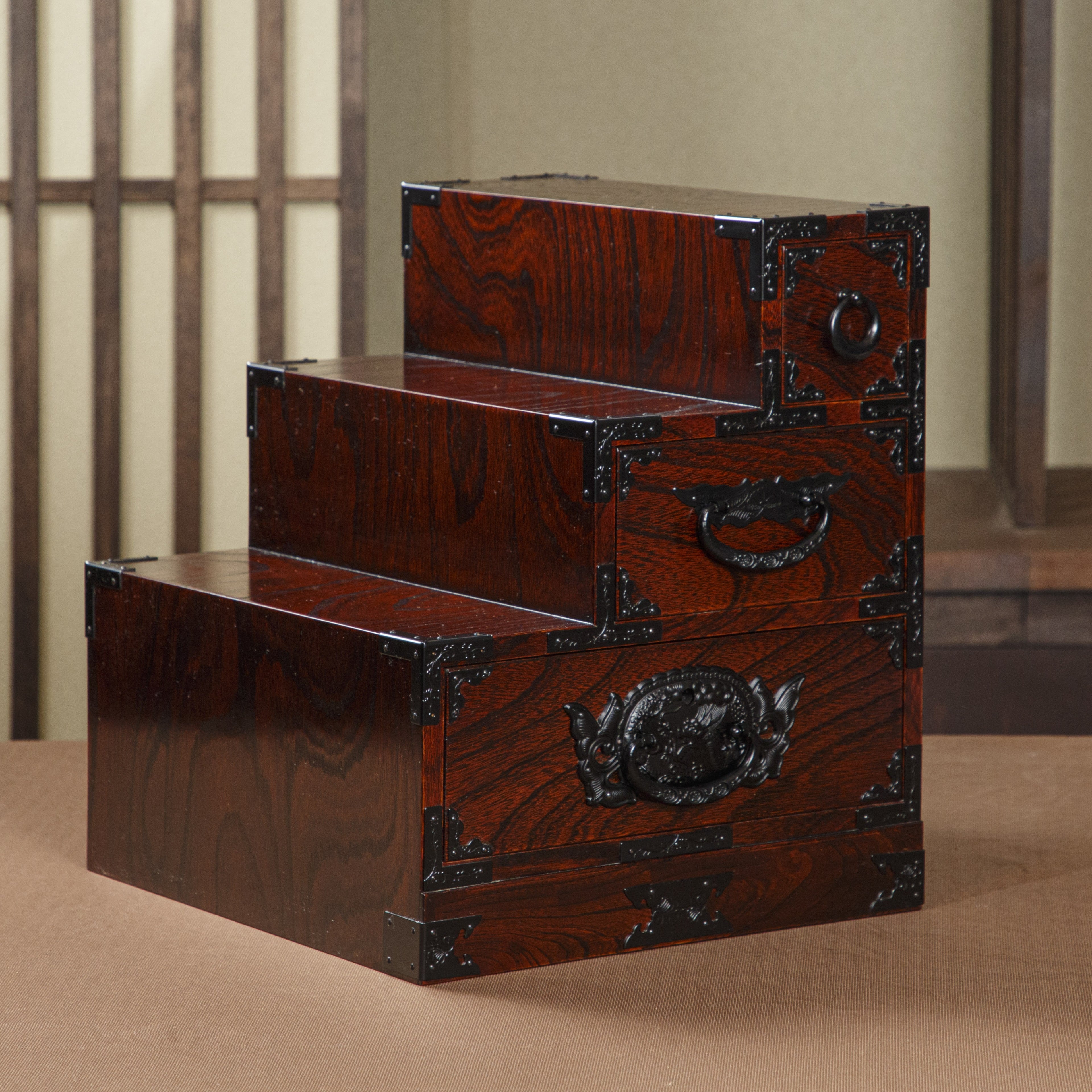 元々は階段下にはめ込んでご使用いただく大きなものが「階段箪笥」として知られておりますが、形はそのままにサイズを縮小して商品化しました。