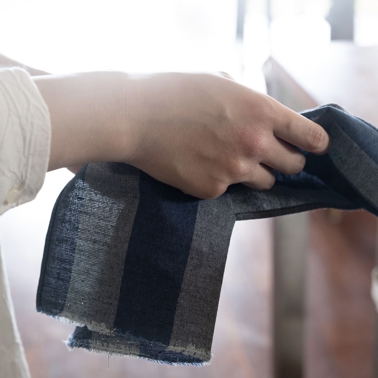 手拭きとしてだけでなく、首に巻いてストールにしたり、テーブルランナー等にもお使いいただけます。フリンジ部分は生地の耳部分で生地端になります。
