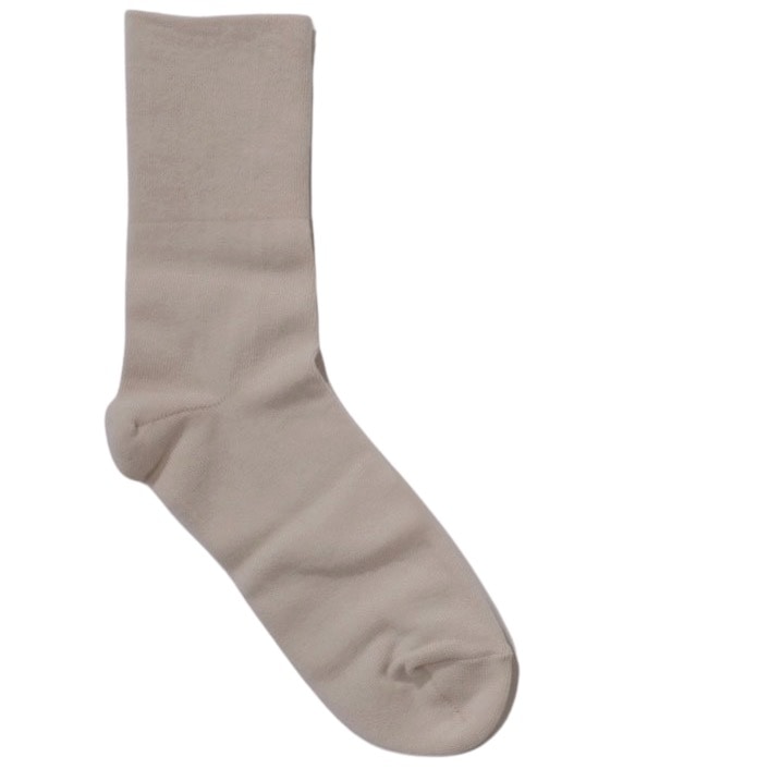ゴムの糸を使わず高品質の柔らかい綿糸を使い、古い編み機でゆっくり丁寧に編むことで肌触りが良くふっくらした風合いが特徴の、足を入れたときに感じる心地良さが印象的な靴下です。