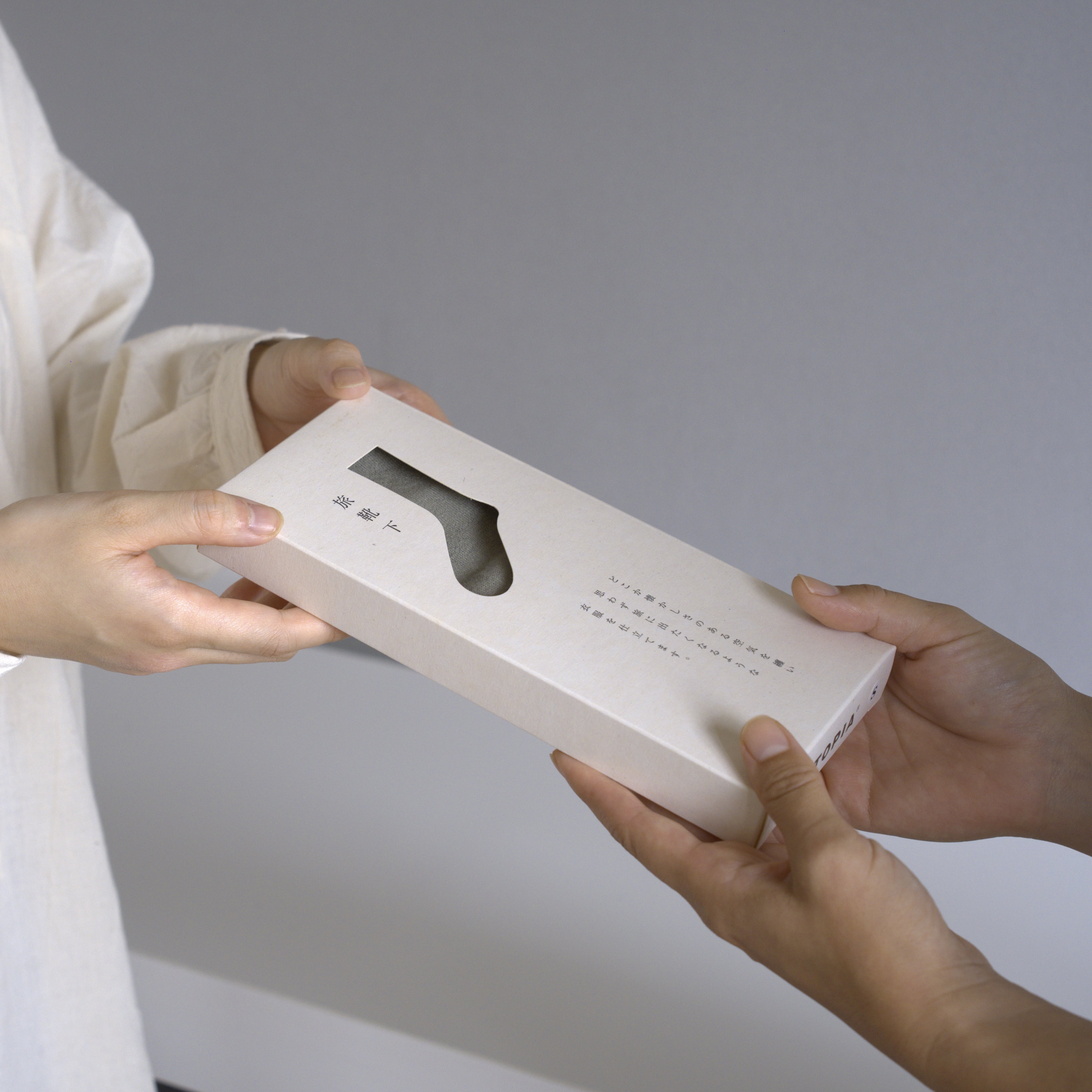 ゴムの糸を使わず高品質の柔らかい綿糸を使い、古い編み機でゆっくり丁寧に編むことで肌触りが良くふっくらした風合いが特徴の、足を入れたときに感じる心地良さが印象的な靴下です。