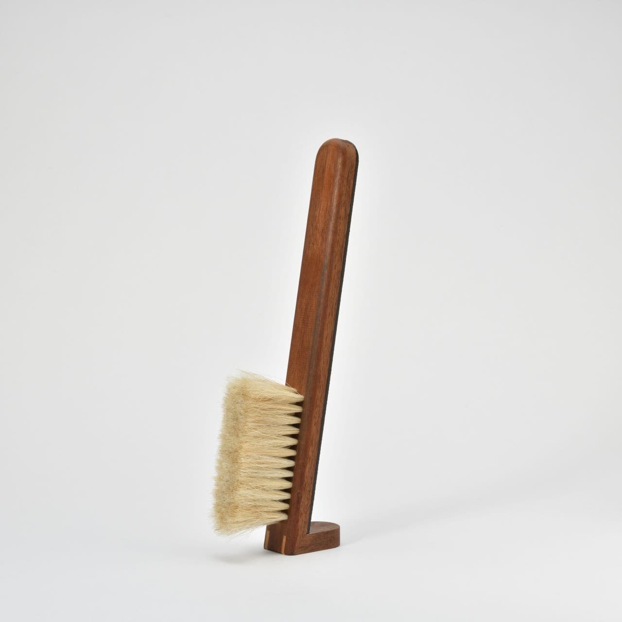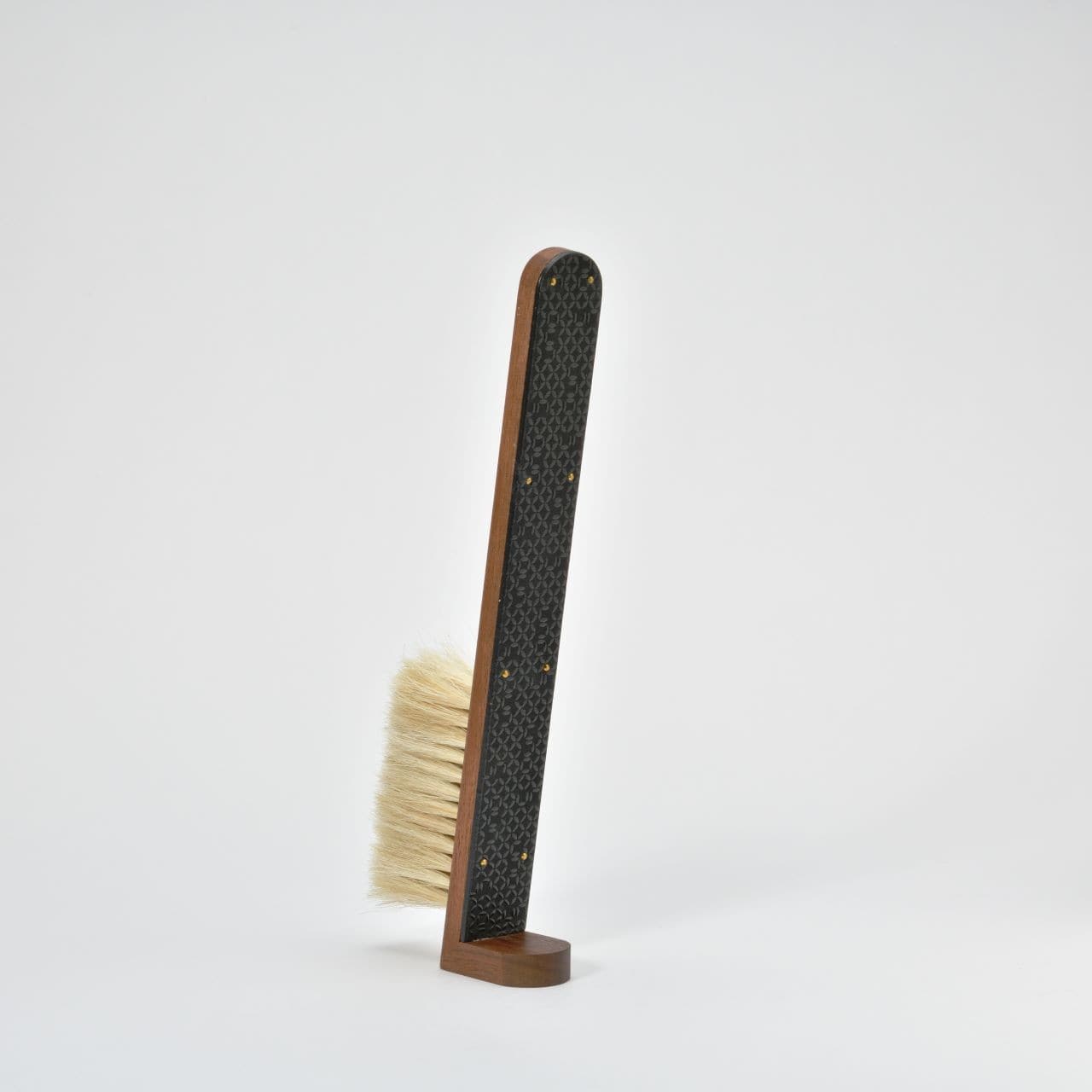 飾って魅せる、自立式のマルチブラシ。柔らかさと弾力性を兼ね備えた希少で上質な天然毛を手植えし、持ち手には指物の技術を使い強度の高い木材を加工、既存のブラシと異なり背面にレザーを採用する事で適度なグリップ性による手馴染み、印伝や北斎といったデザイン性も兼ね備えた、洋服・靴・卓上と多用途で実用的かつ耐久性と美しさに優れたブラシが完成しました。