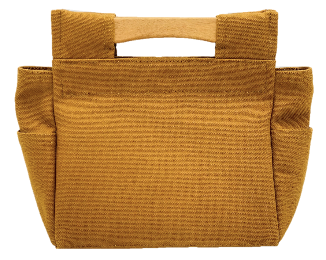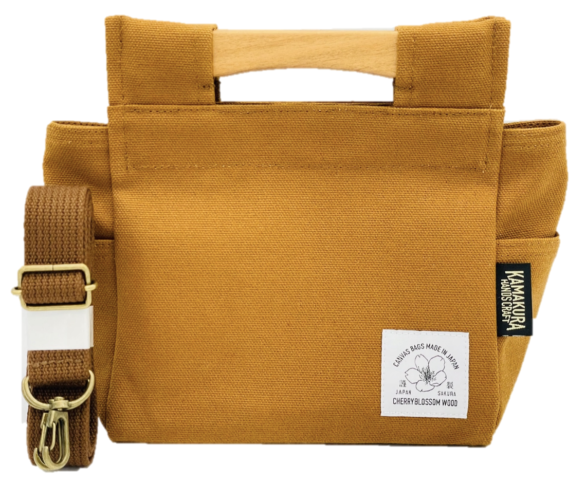 このバッグのハンドルは、香川県内で公共工事の際に伐採された天然林の山桜を使用しています。高級家具の製造から外れた木材をハンドルへと加工した新しいスタイルのアップサイクル商品です。