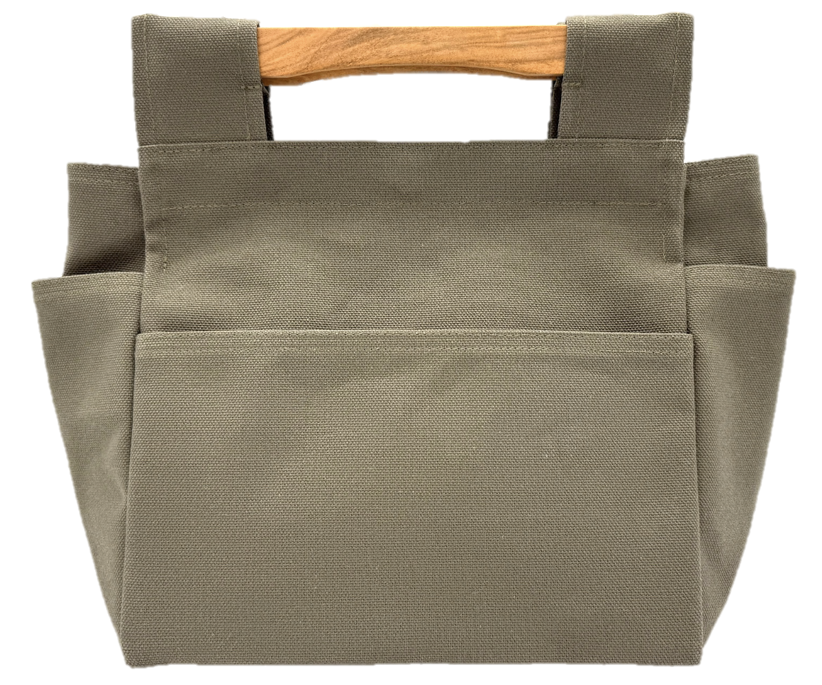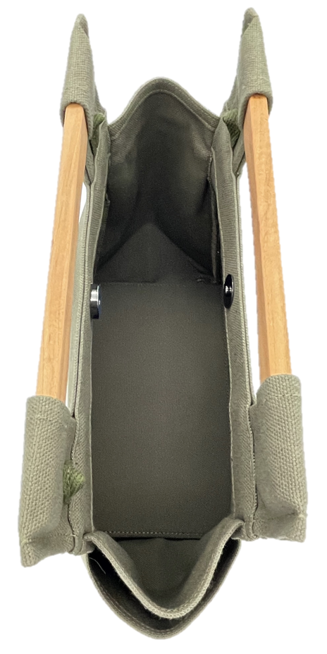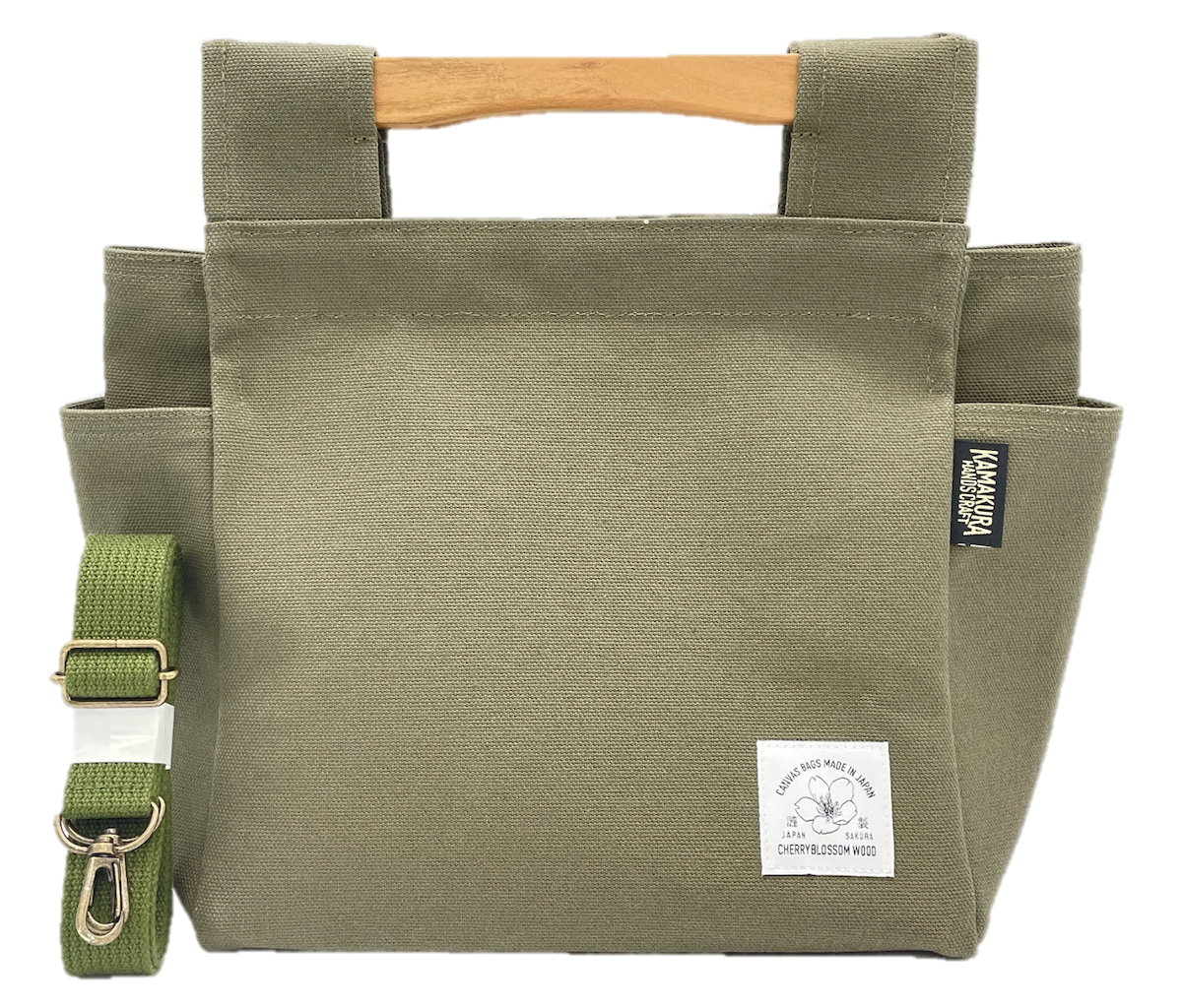 このバッグのハンドルは、香川県内で公共工事の際に伐採された天然林の山桜を使用しています。高級家具の製造から外れた木材をハンドルへと加工した新しいスタイルのアップサイクル商品です。