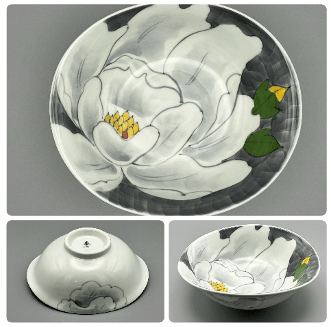 現在人気上昇中の形状である煮物鉢。もともとは料亭や旅館に向付としてご提案していた形状を「煮物鉢」としてリニューアル。特に冬場のおでんやスープ鍋の取鉢として人気です。もちろん肉じゃがなどの煮物、一人前の刺身やサラダにも最適です。薄墨新牡丹の絵柄は薄墨牡丹のアレンジで泰山の人気絵柄の一つです。染付の技法である色呉須を活かし食洗機にも対応しております。電子レンジ〇 食洗機〇 直火X オーブンX 全てが職人の手による手造りの品となります色合いや形状、厚みなど一点ずつ違いがございます。