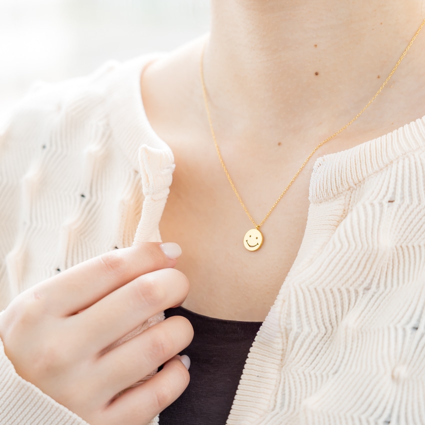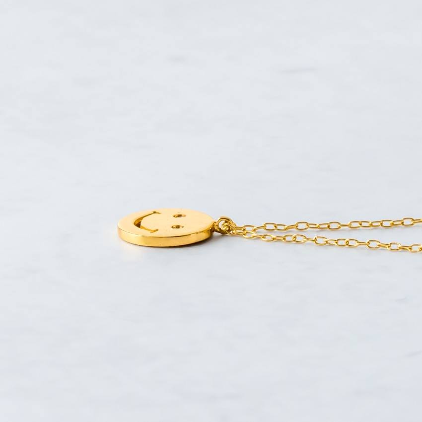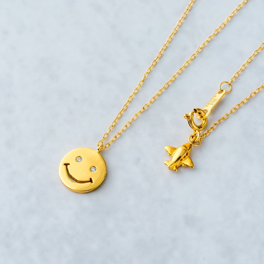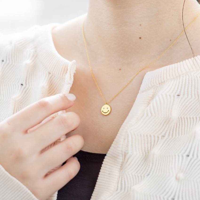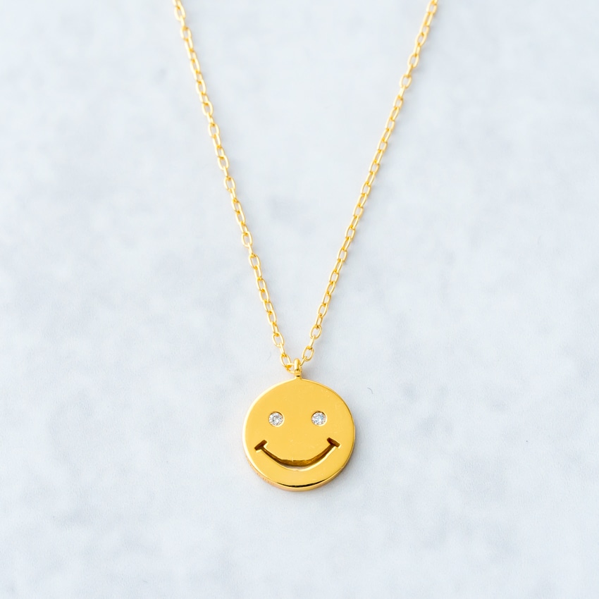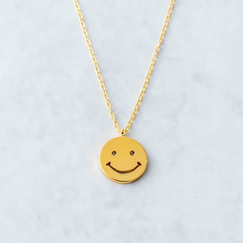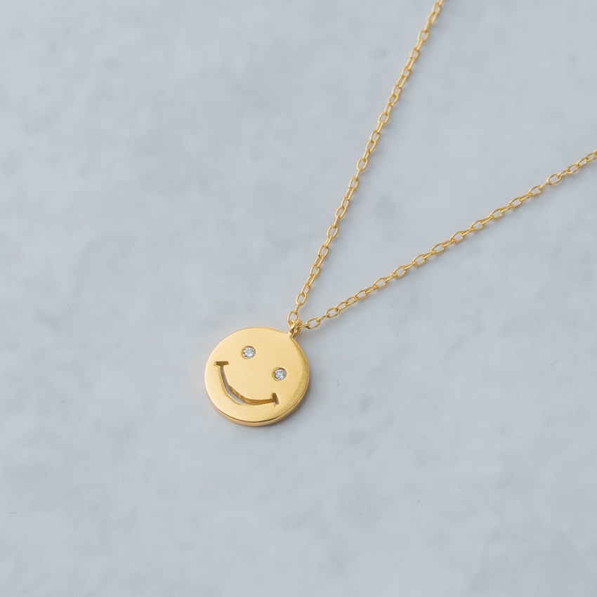 他のネックレスと合わせやすく、スマイルモチーフが程よいアクセントに。レイヤードスタイルにも自然に馴染みます。