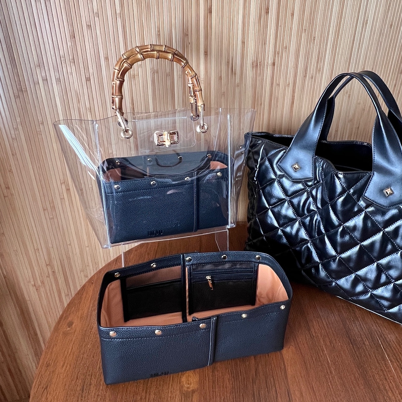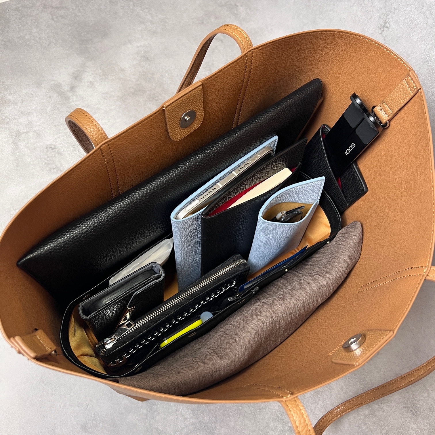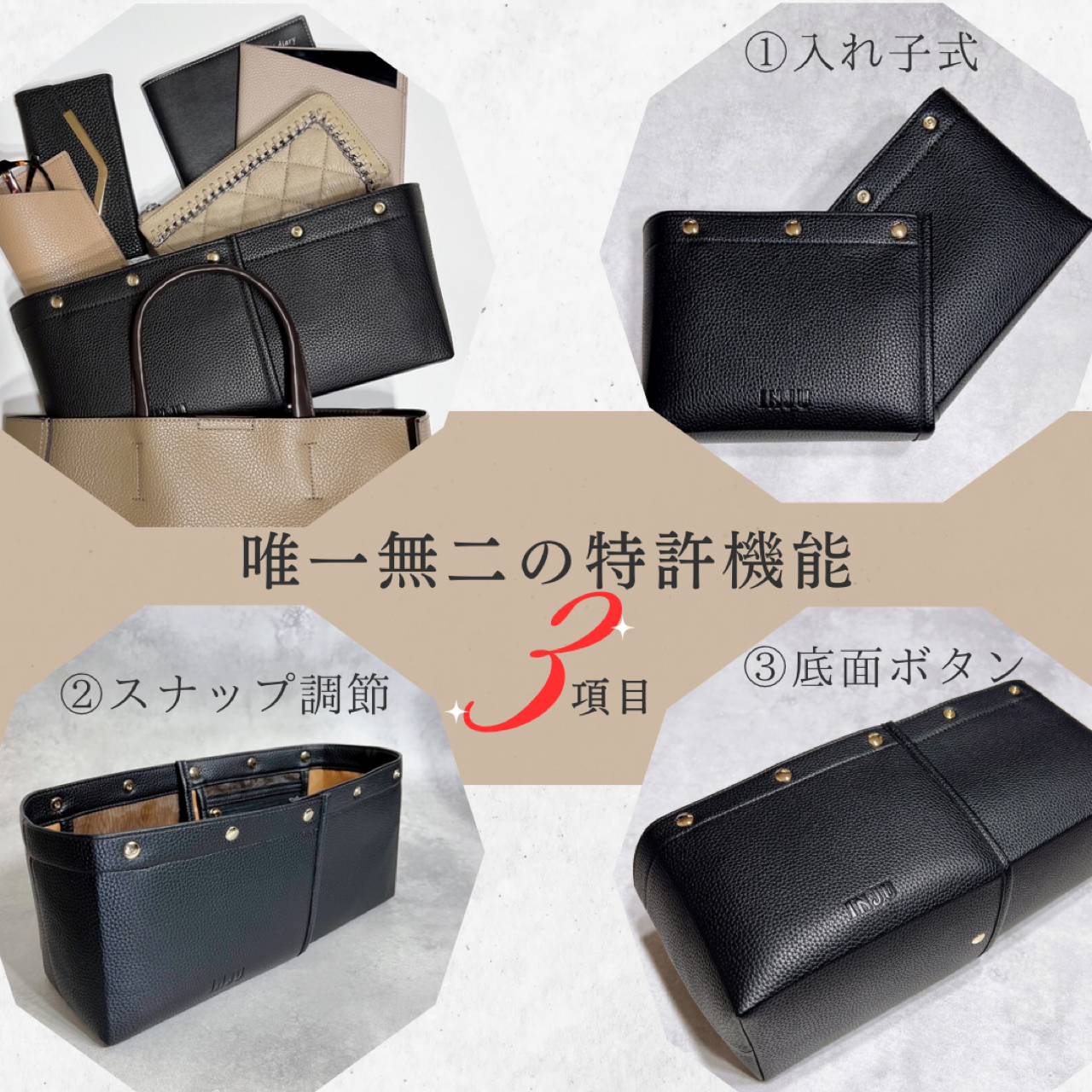 「舟型スクエア型両用タイプ」バッグインバッグの概念を超えたと言われる特許機能付き横幅可変式の3WAYレイアウトオーガナイザー。バッグの中の空間設計を叶え、バッグの大きさや荷物に応じて大中小の3サイズから使い分けが可能です。収納することがゴールではなく、モノの出し入れをする時にストレスフリーな出し入れが叶うよう設計された完全自立型も特長。全4箇所のメッシュポケットは視認性が高く、軽量化のために上質なPUレザーを使用。ボックティッシュ約1箱分の軽さを実現いたしました。仕切り効果が高く、バッグの中が見やすくなる明るいカラーもポイントです。ミニバッグからマチのある大きめトートバッグにまで対応可能です。