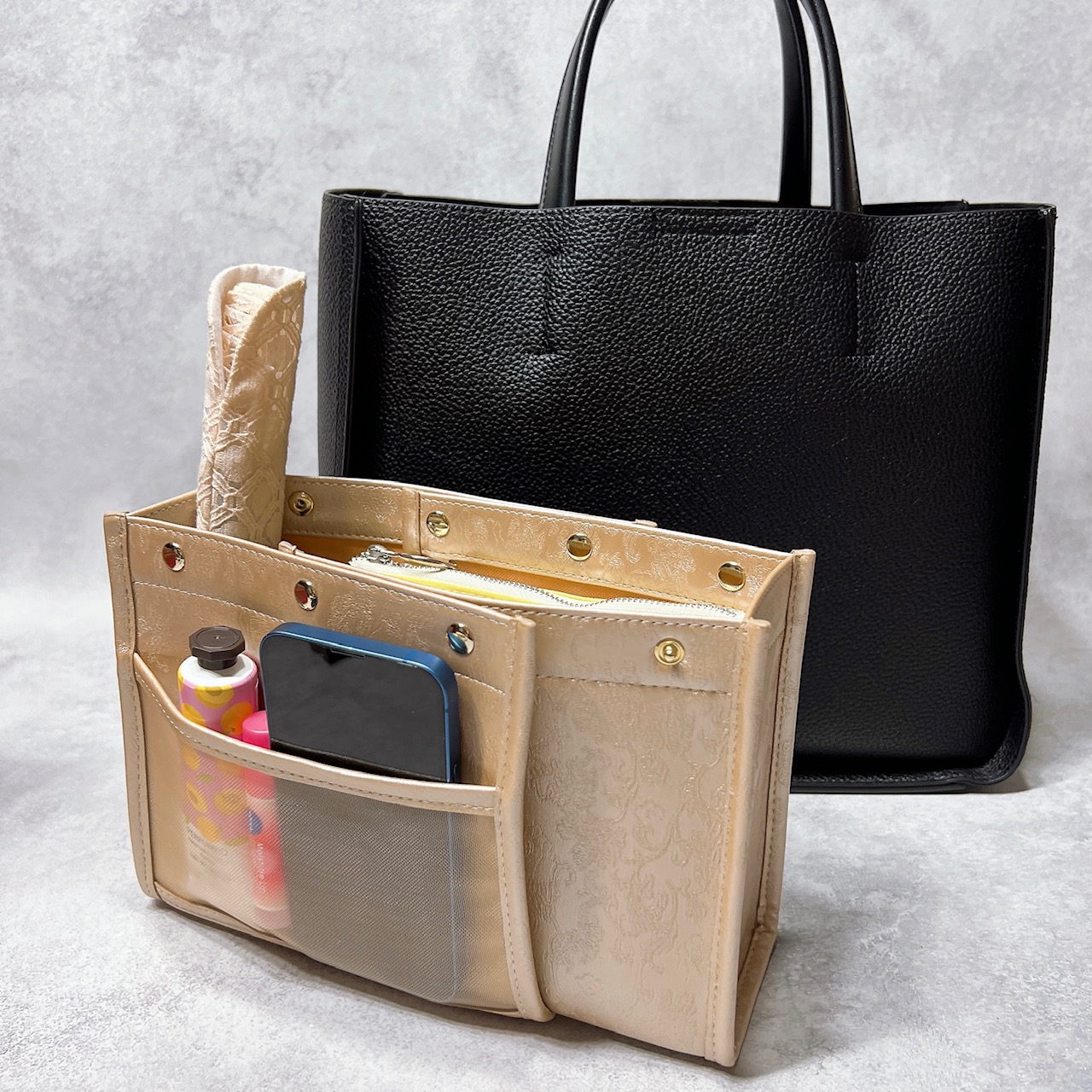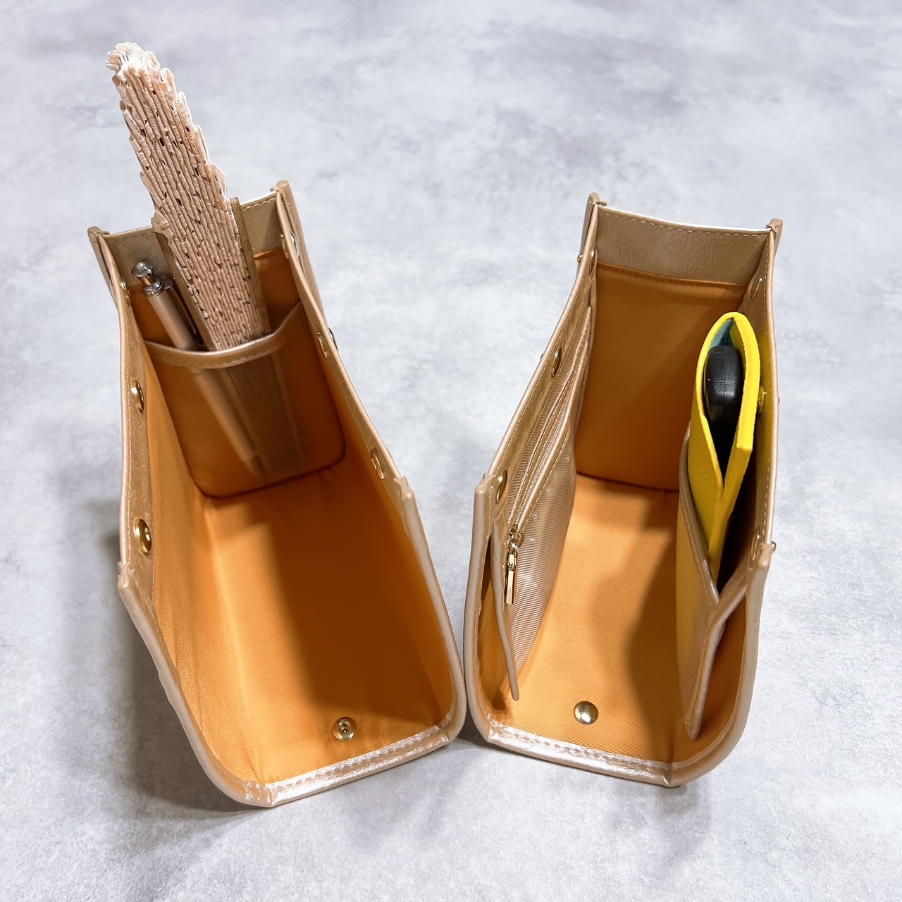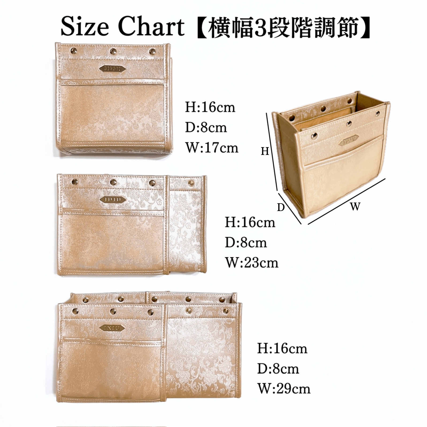 「スクエア型」バッグインバッグの概念を超えたと言われる特許機能付き横幅可変式の3WAYレイアウトオーガナイザー。バッグの中の空間設計を叶え、バッグの大きさや荷物に応じて大中小の3サイズから使い分けが可能です。収納することがゴールではなく、モノの出し入れをする時にストレスフリーな出し入れが叶うよう設計された完全自立型も特長。全4箇所のメッシュポケットは視認性が高く、軽量化のために上質なPUレザーを使用。ボックティッシュ約1箱分の軽さを実現いたしました。仕切り効果が高く、バッグの中が見やすくなる明るいカラーもポイントです。