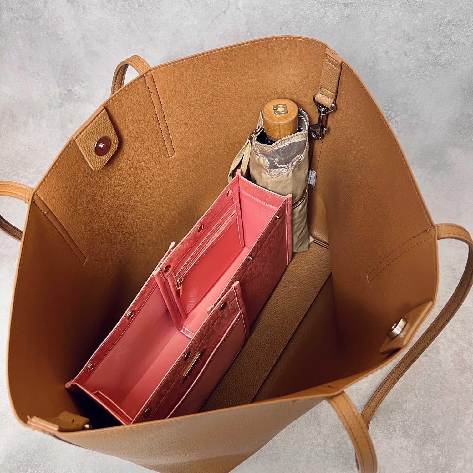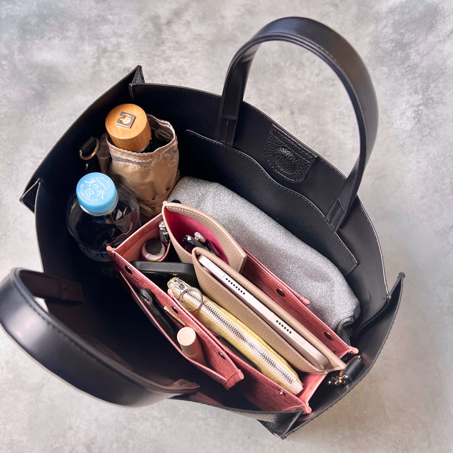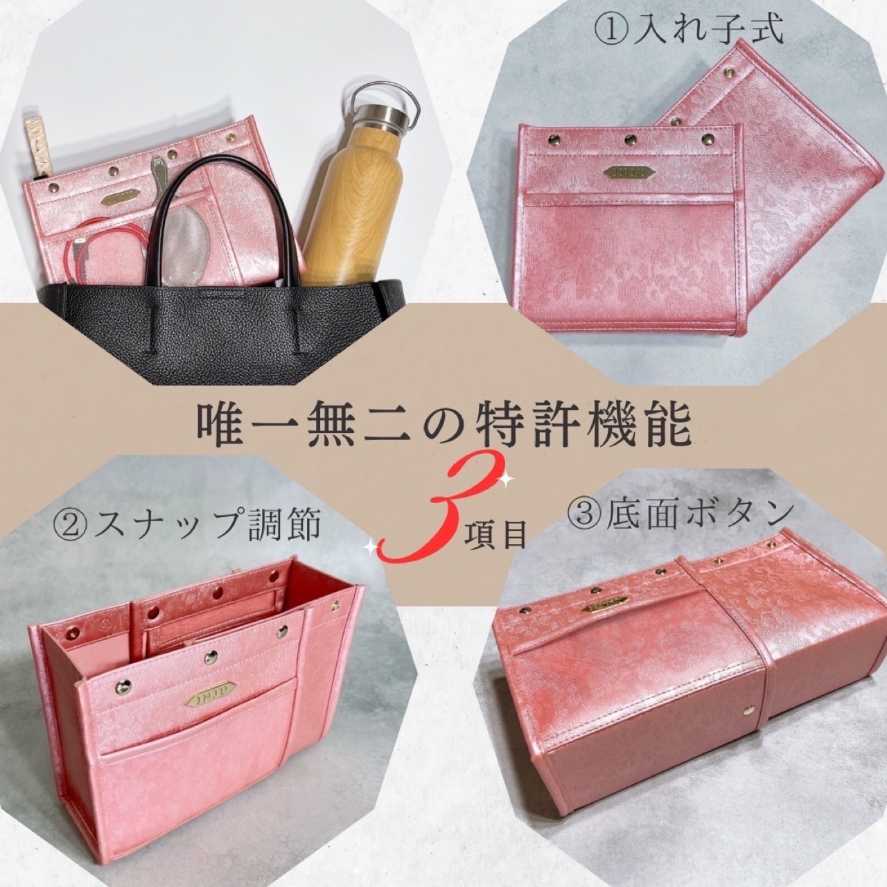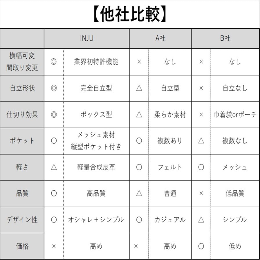 「スクエア型」バッグインバッグの概念を超えたと言われる特許機能付き横幅可変式の3WAYレイアウトオーガナイザー。バッグの中の空間設計を叶え、バッグの大きさや荷物に応じて大中小の3サイズから使い分けが可能です。収納することがゴールではなく、モノの出し入れをする時にストレスフリーな出し入れが叶うよう設計された完全自立型も特長。全4箇所のメッシュポケットは視認性が高く、軽量化のために上質なPUレザーを使用。ボックティッシュ約1箱分の軽さを実現いたしました。仕切り効果が高く、バッグの中が見やすくなる明るいカラーもポイントです。