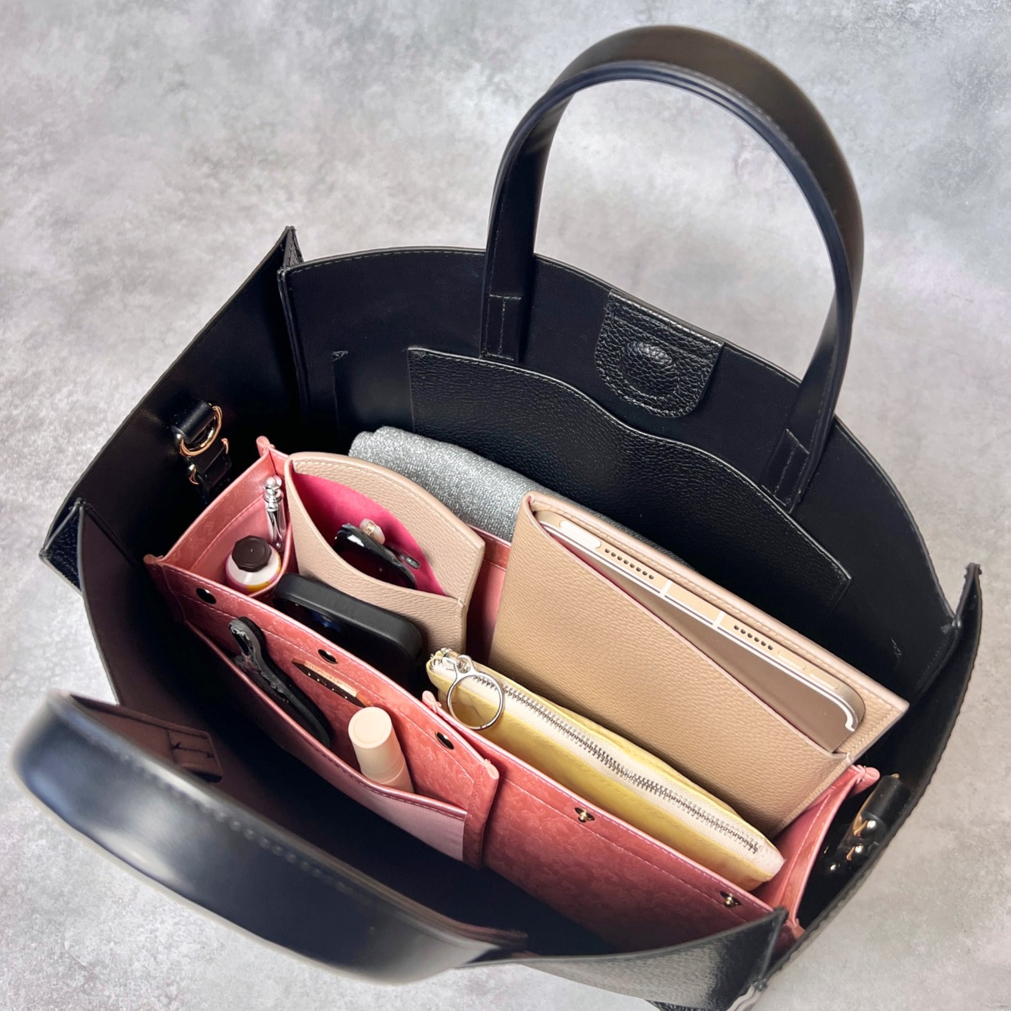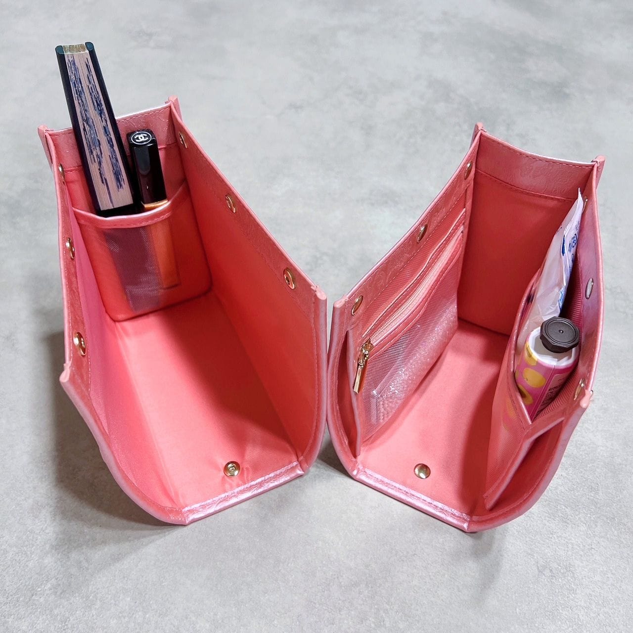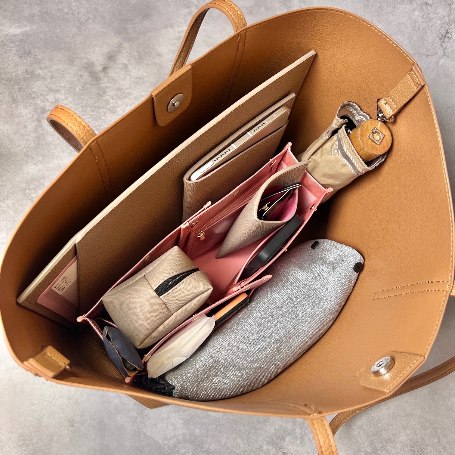 「スクエア型」バッグインバッグの概念を超えたと言われる特許機能付き横幅可変式の3WAYレイアウトオーガナイザー。バッグの中の空間設計を叶え、バッグの大きさや荷物に応じて大中小の3サイズから使い分けが可能です。収納することがゴールではなく、モノの出し入れをする時にストレスフリーな出し入れが叶うよう設計された完全自立型も特長。全4箇所のメッシュポケットは視認性が高く、軽量化のために上質なPUレザーを使用。ボックティッシュ約1箱分の軽さを実現いたしました。仕切り効果が高く、バッグの中が見やすくなる明るいカラーもポイントです。