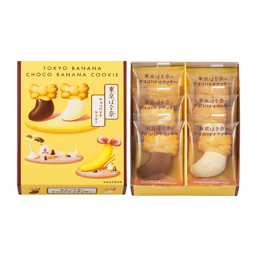 リボンをつけた東京ばな奈デザインのぷっくり分厚いバナナクッキーに、チョコレートのおいしさをとろりとかけた『東京ばな奈のチョコバナナクッキー』。Doleブランドのおいしいバナナを合わせた特製バナナバターを生地に練り込んで、サクサク食感に焼きあげました。