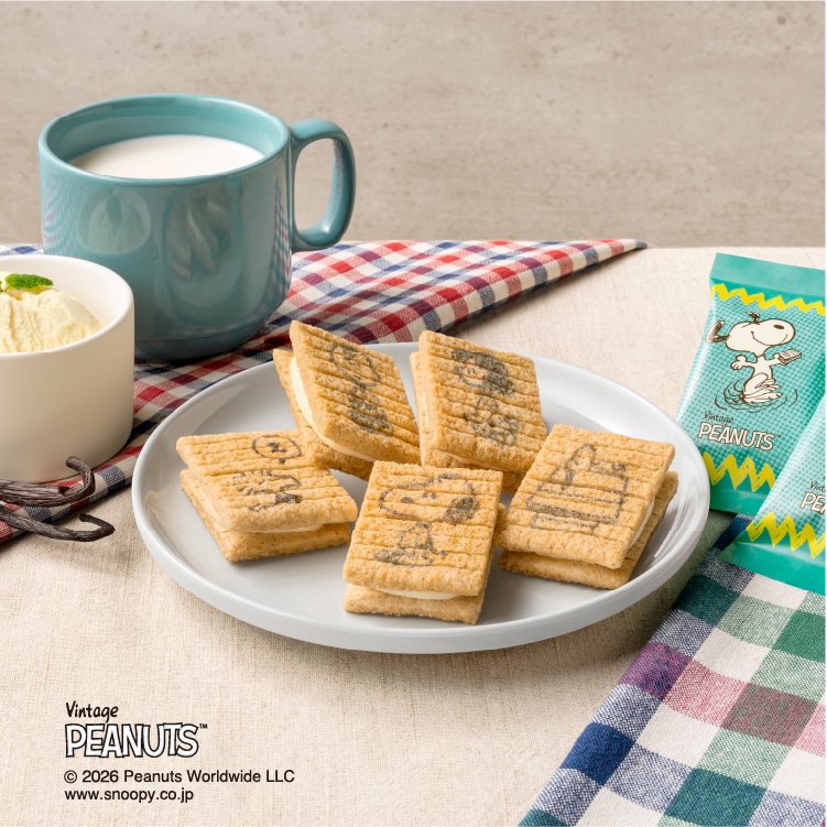 コミック「PEANUTS」で スヌーピーのおやつタイムで好物として登場する マシュマロをイメージした「スヌーピー シュガーバターサンドの木」。 マシュマロみたいに“ふわもこ”なホワイトショコラを、 ほんのりバニラ香るシリアル生地でサンドしました。 みんなで一緒に癒されるおやつタイムを楽しんで。