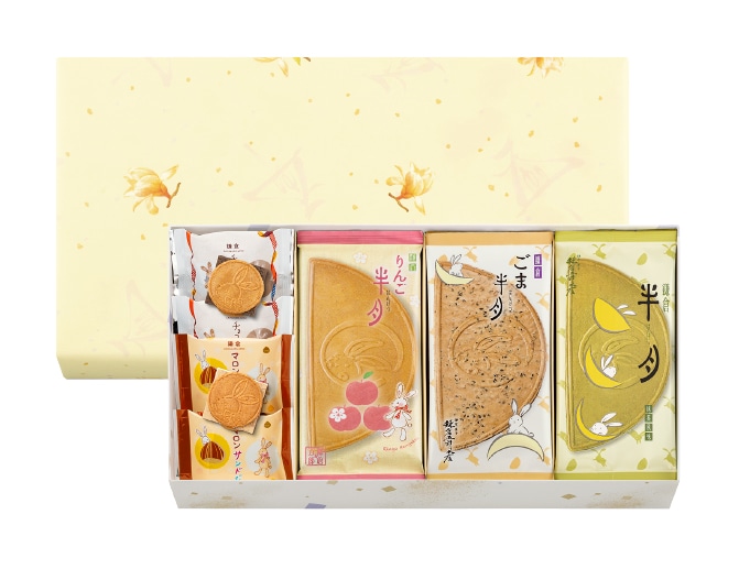 季節限定のお味「りんご半月」と「ごま半月」、モンブランをイメージした「鎌倉マロンサンドだょ」が揃った、秋冬の詰合せ。古都鎌倉からお届けする、自慢の味わいの詰合せは、贈り物や季節のご挨拶にもぴったりのひと箱です。