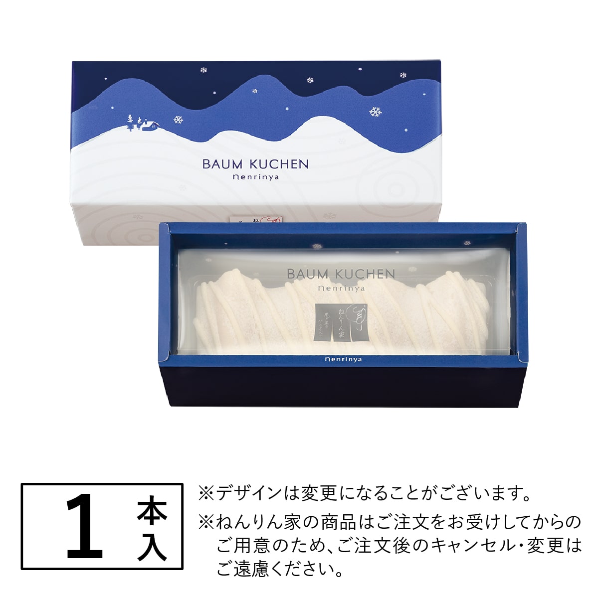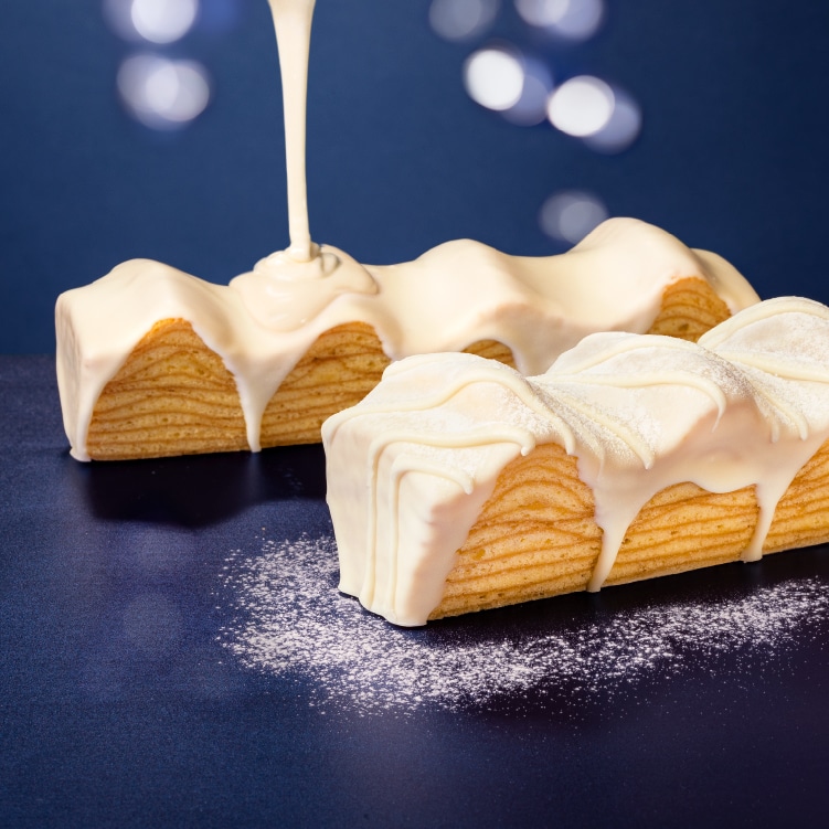 代表作『マウントバーム しっかり芽』に、ミルクのコク豊かなホワイトショコラをまるで雪のようにとろりとかけた『雪色のマウントバーム』は、冬限定の特別なバームクーヘンです。