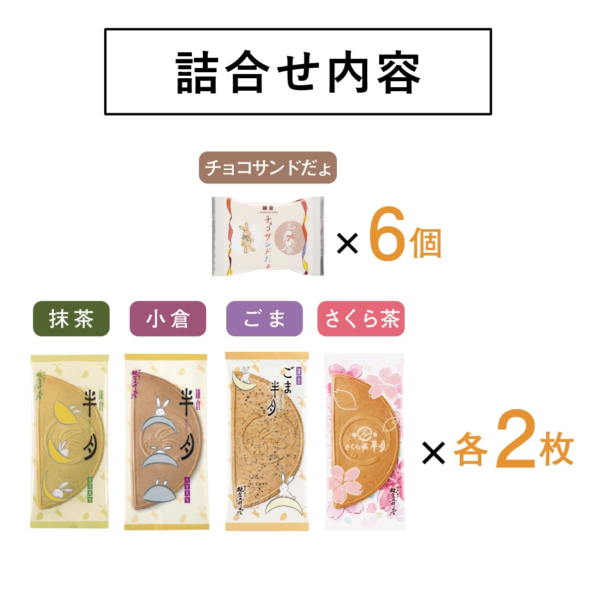 「ごま半月」と春限定のお味「さくら茶半月」、和が香るクリームをはさんだ定番「鎌倉半月」に、愛らしい満月のショコラサンド「鎌倉チョコサンドだょ」も寄り添いました。〈鎌倉五郎本店〉の自慢の味わいを揃えたひと箱は、贈り物やお手みやげとして人気です。