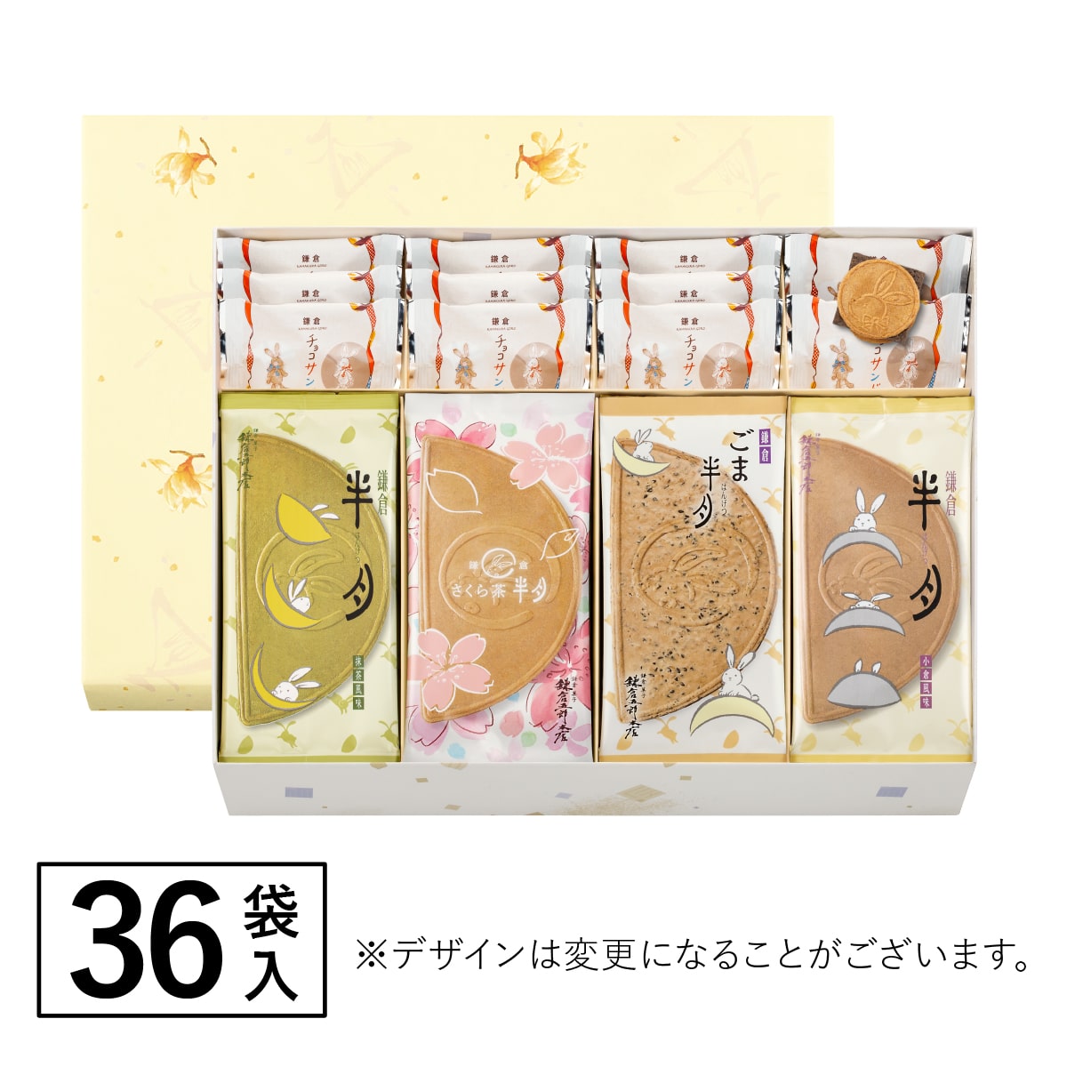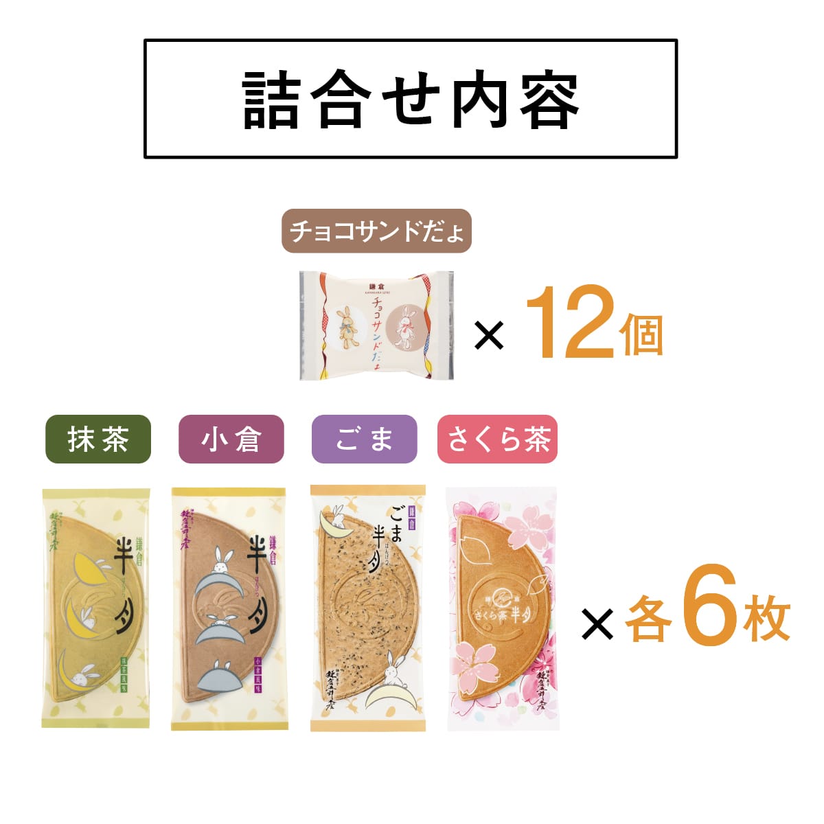 「ごま半月」と春限定のお味「さくら茶半月」、和が香るクリームをはさんだ定番「鎌倉半月」に、愛らしい満月のショコラサンド「鎌倉チョコサンドだょ」も寄り添いました。〈鎌倉五郎本店〉の自慢の味わいを揃えたひと箱は、贈り物やお手みやげとして人気です。
