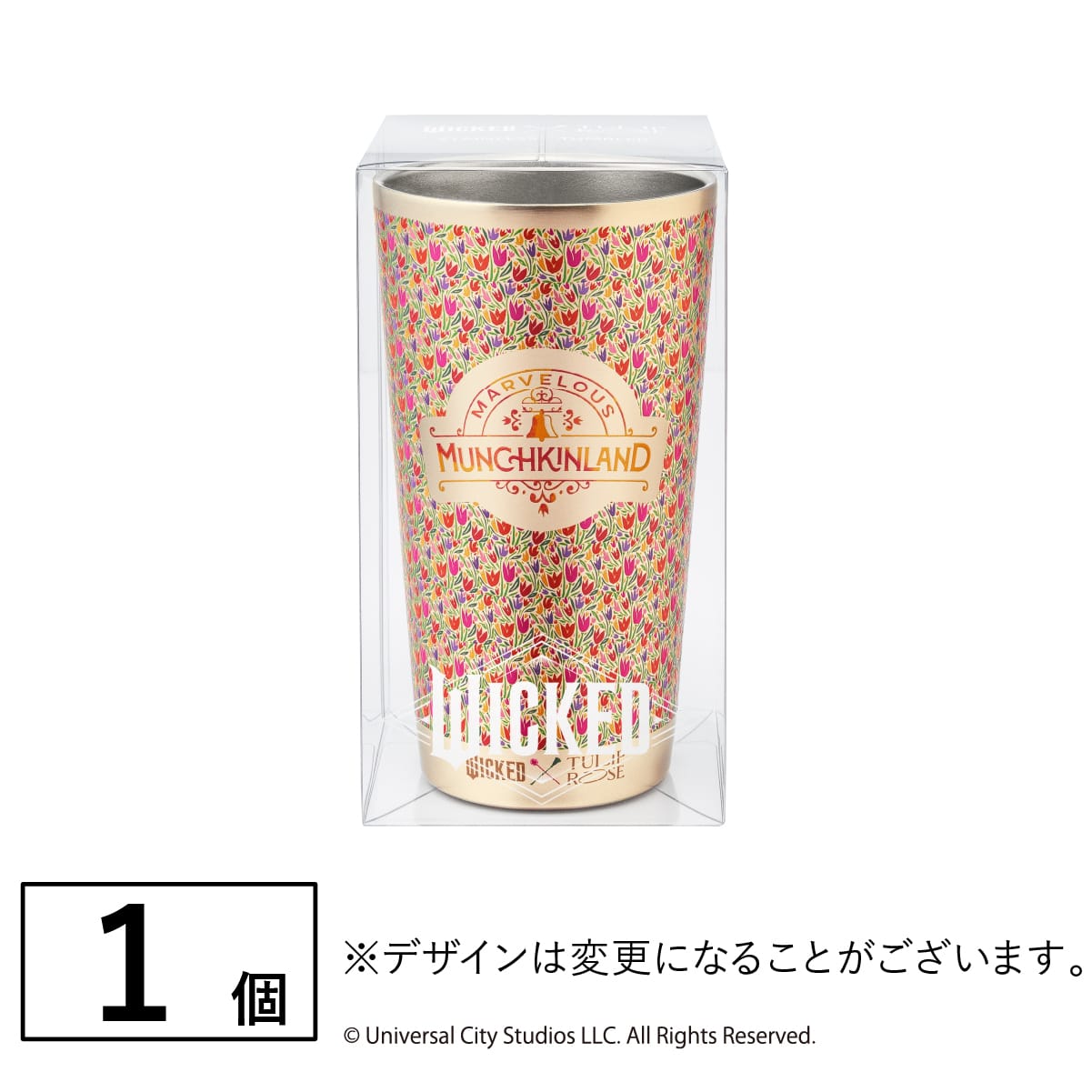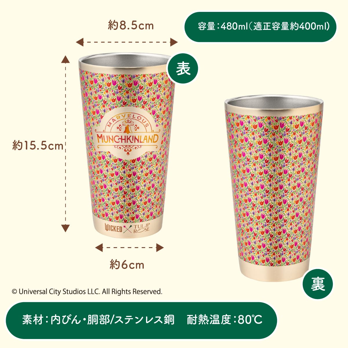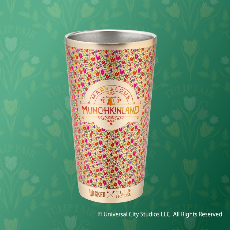 映画『ウィキッド 永遠の約束』の舞台の一部であるマンチキンランドに広がる華やかなチューリップ畑が描かれたタンブラーです。