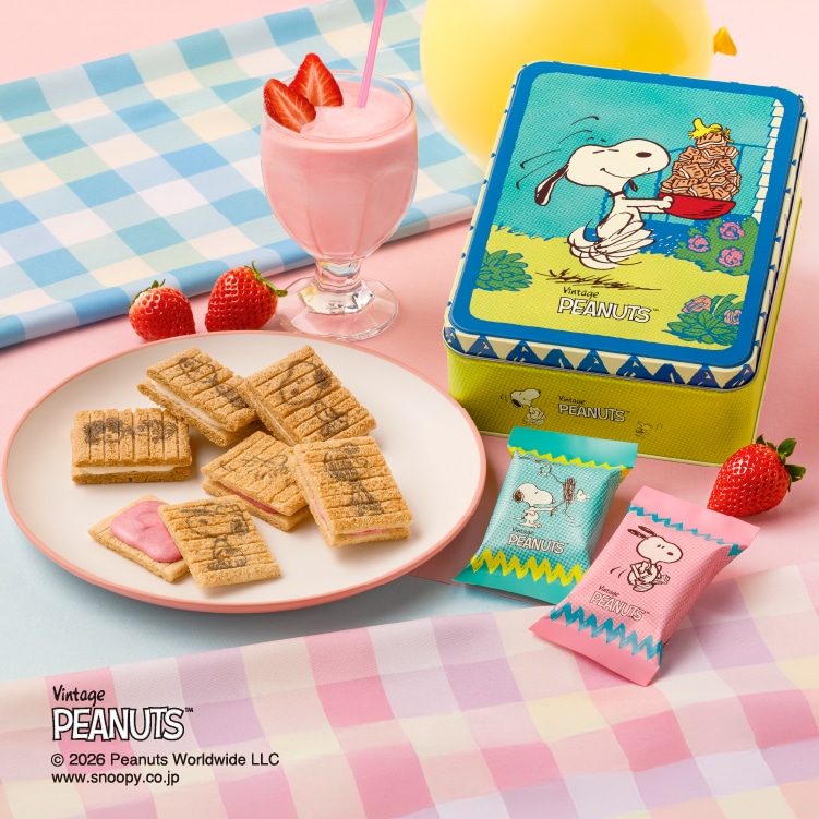 「スヌーピー シュガーバターサンドの木」と「スヌーピー シュガーバターサンドの木 ストロベリーシェイク風」、2つの味をお楽しみいただける詰合せ。
