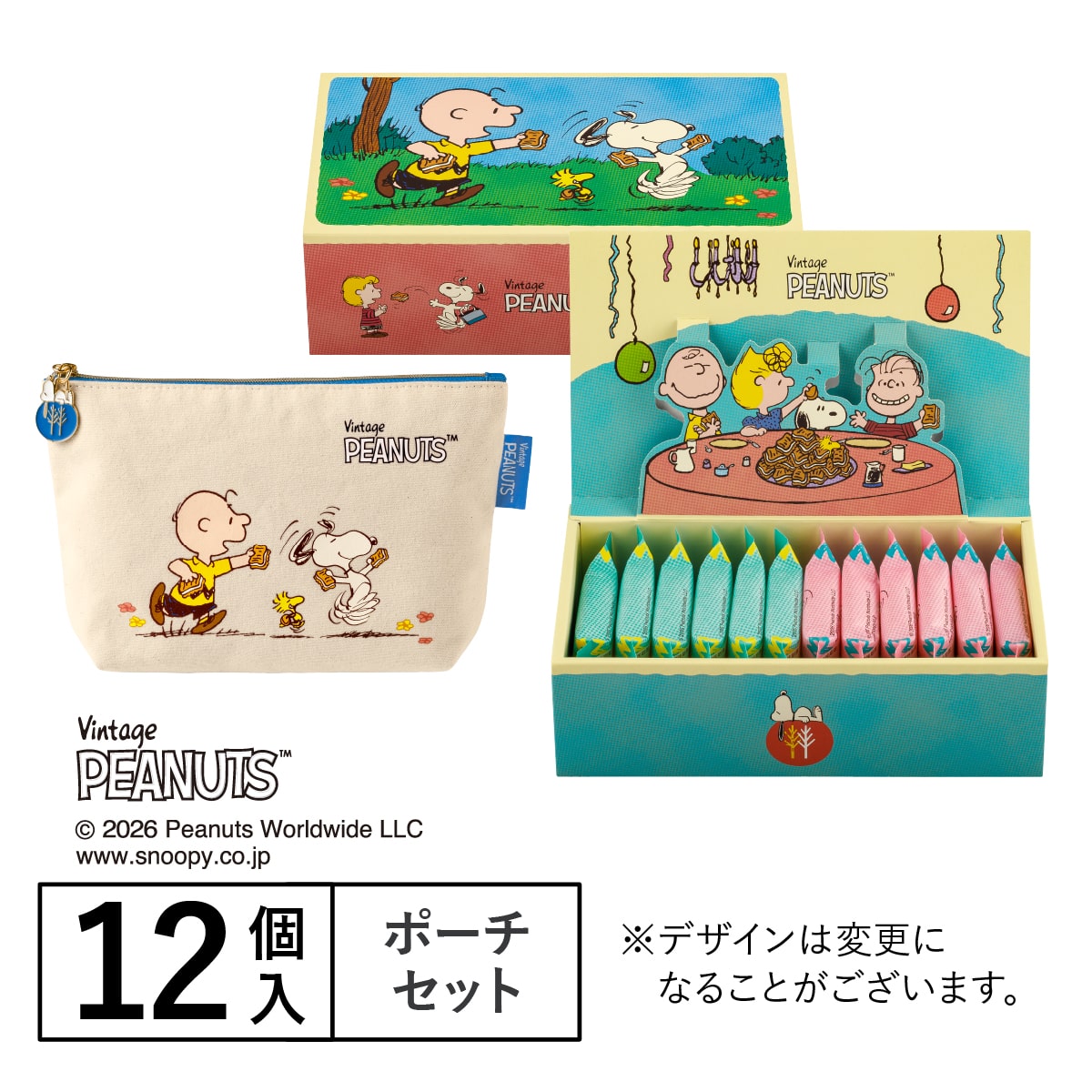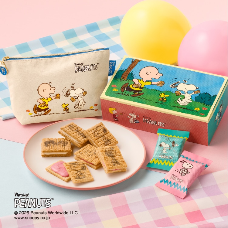 「スヌーピー シュガーバターサンドの木」と「スヌーピー シュガーバターサンドの木 ストロベリーシェイク風」、2つの味をお楽しみいただける詰合せ。かわいいオリジナルポーチ付きのセットです。