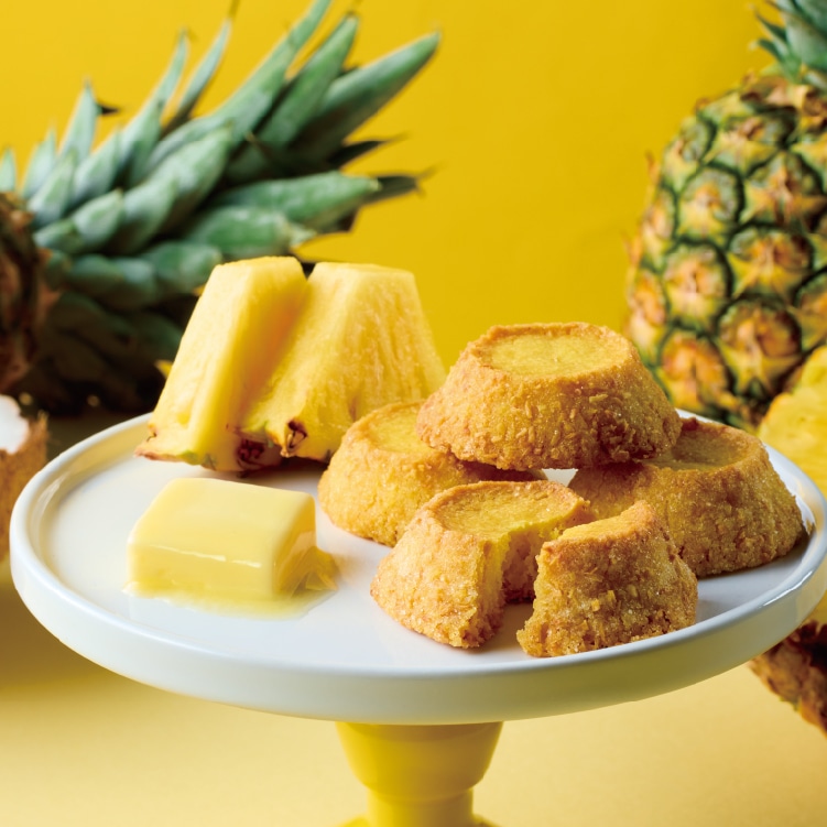 バター含有率30%と、たっぷりのバターを使ったリッチなクッキー。ひとくち頬張れば、パイナップルのジューシーなおいしさが広がります。ココナッツパウダーはあえて粗めにすることで、シャキッとした楽しい食感に!