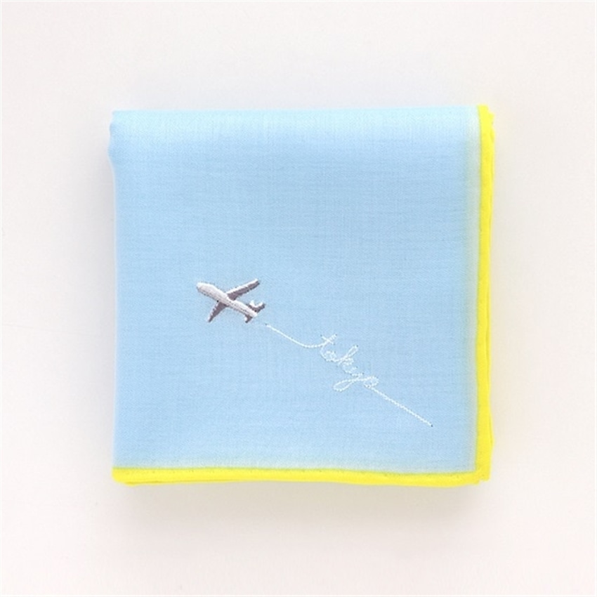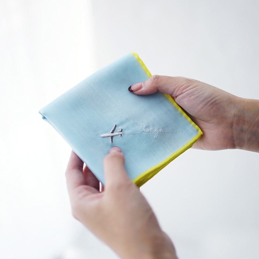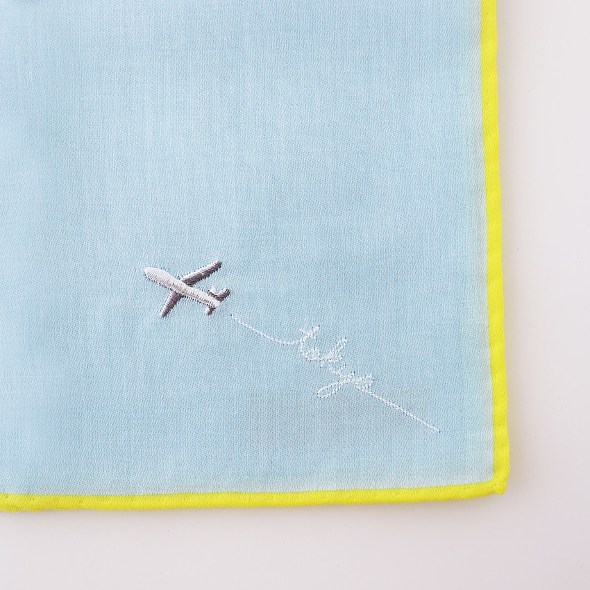 上昇する飛行機の刺繍が空の旅の高揚感を表現しています。