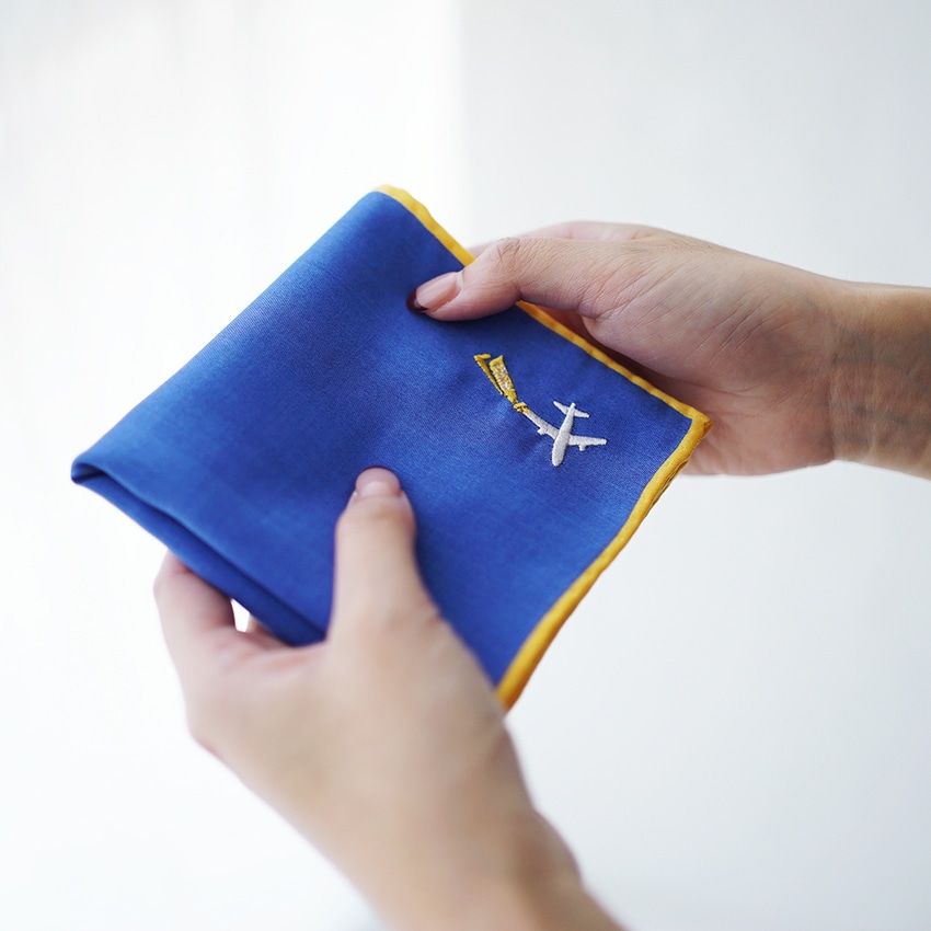 「この空の旅が何か良い切っ掛けや思い出になりますように」そんなイメージで飛行機型の栞のモチーフを刺繍にしました。
