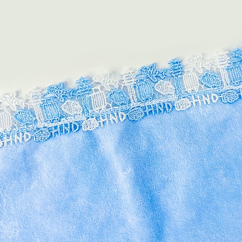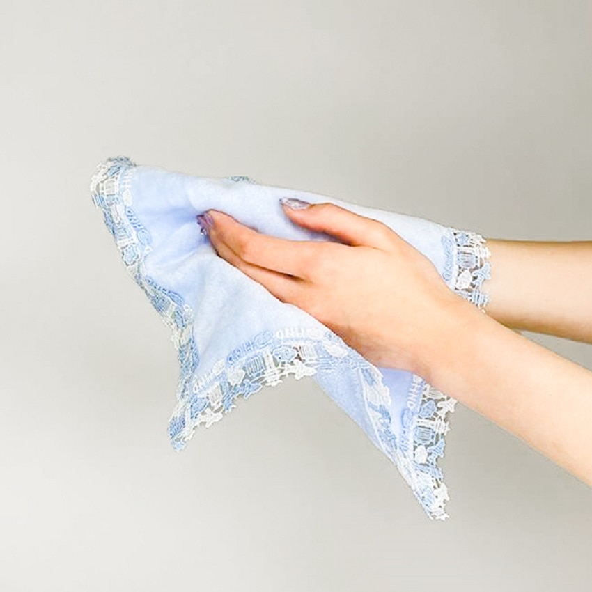 光沢のある糸で織り上げられたレースと、肌触り豊かで大人気の今治産タオル生地のハンカチはお土産やギフトにおすすめです。