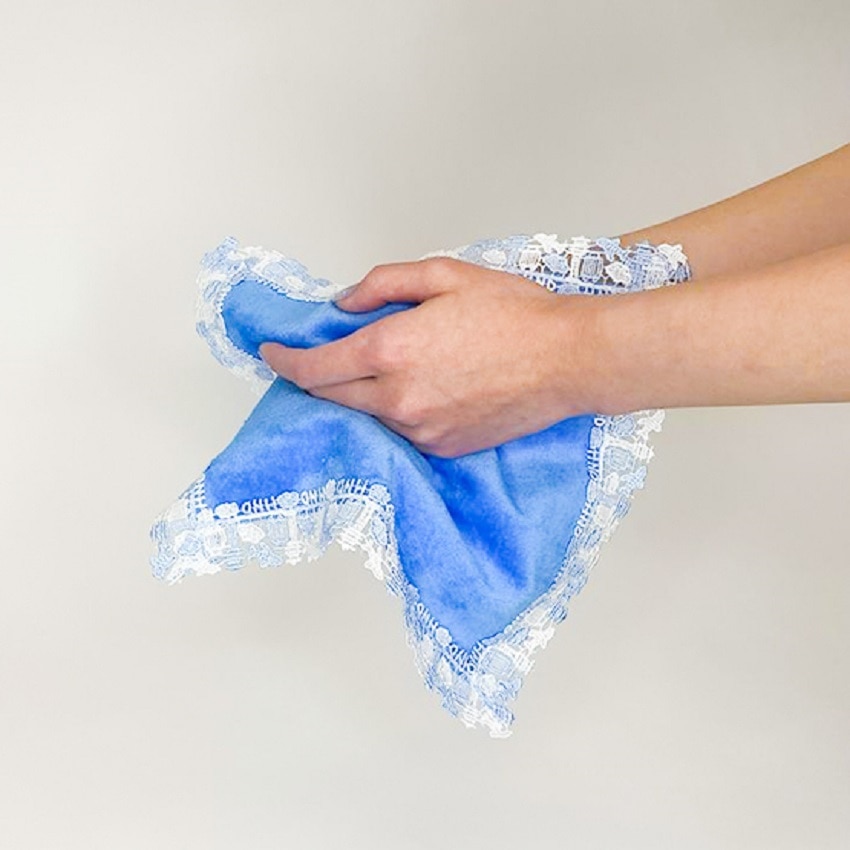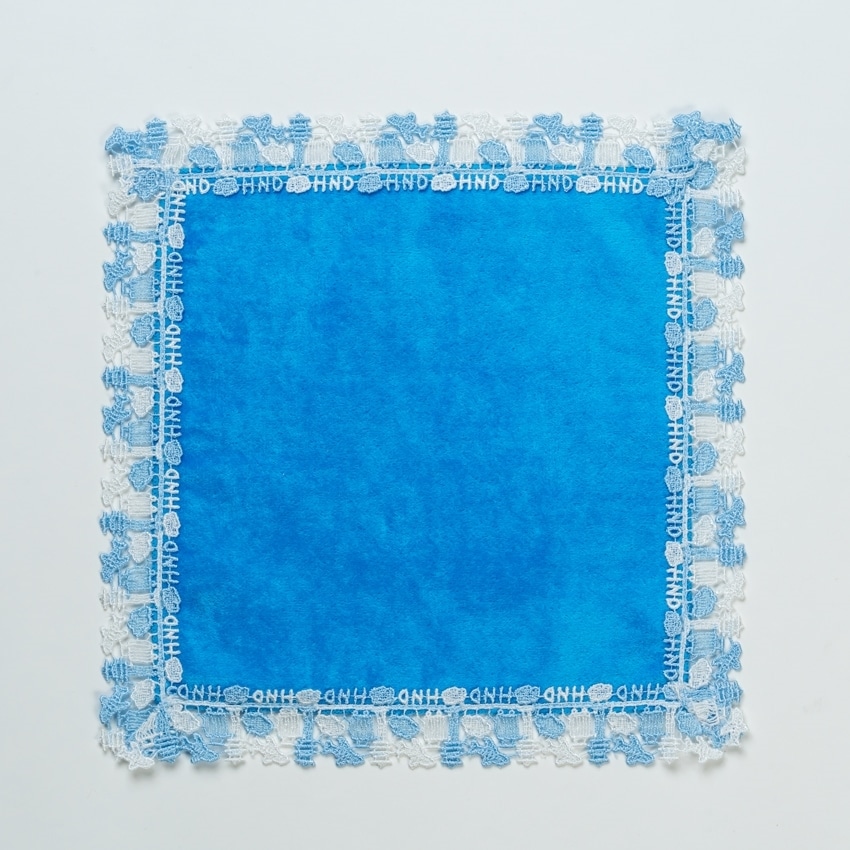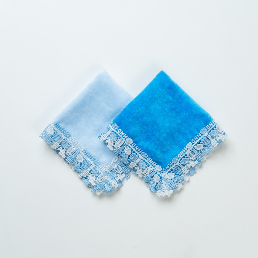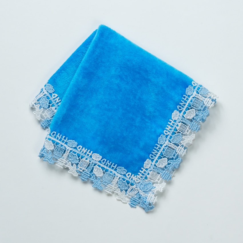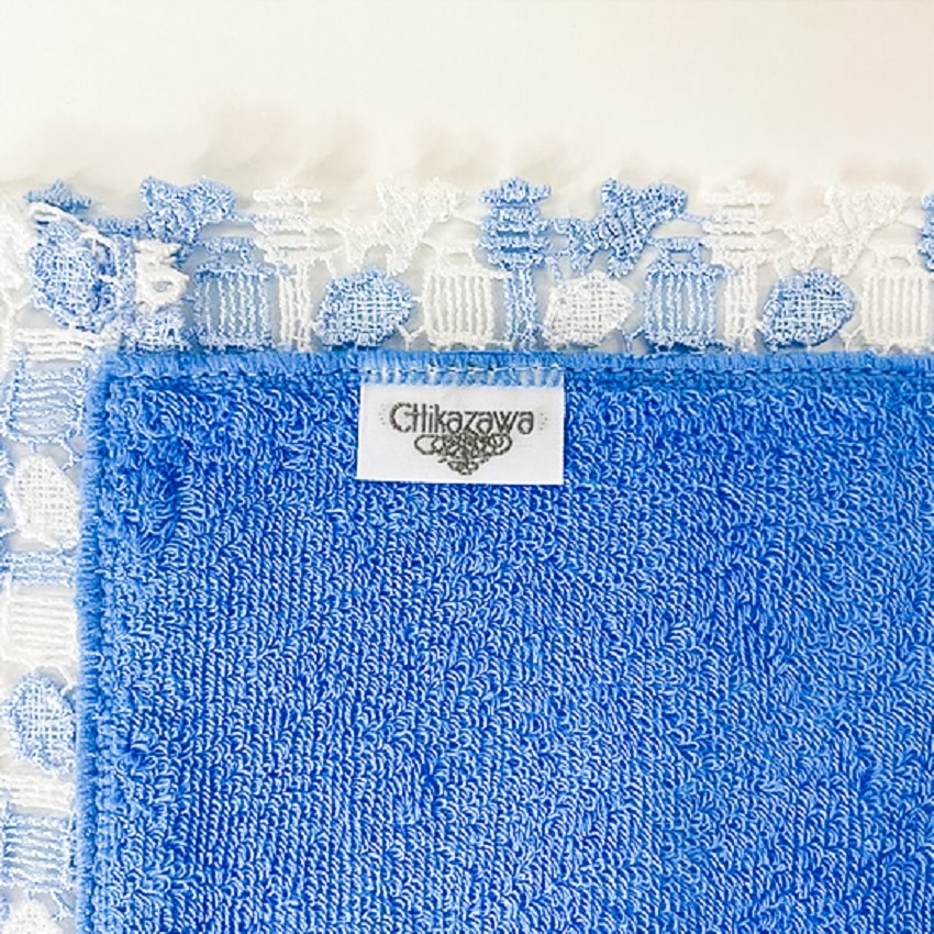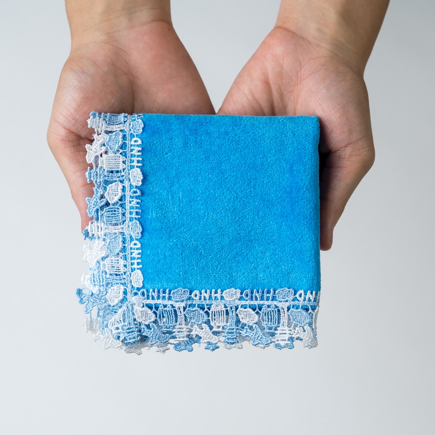光沢のある糸で織り上げられたレースと、肌触り豊かで大人気の今治産タオル生地のハンカチはお土産やギフトにおすすめです。