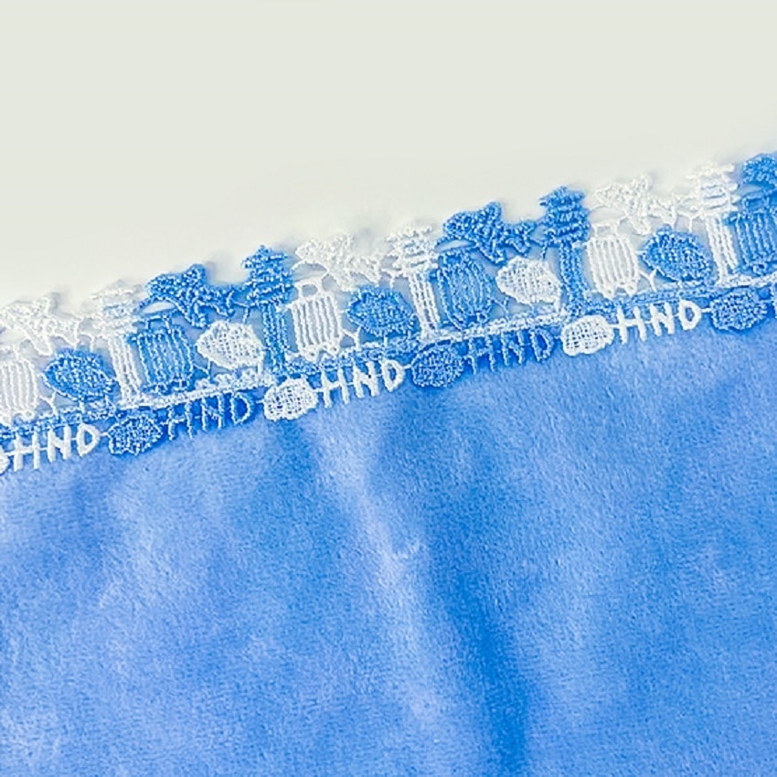 飛行機・雲・管制塔・キャリーバッグのモチーフと、その下には羽田空港の「HND」の文字もレースで表現しています。