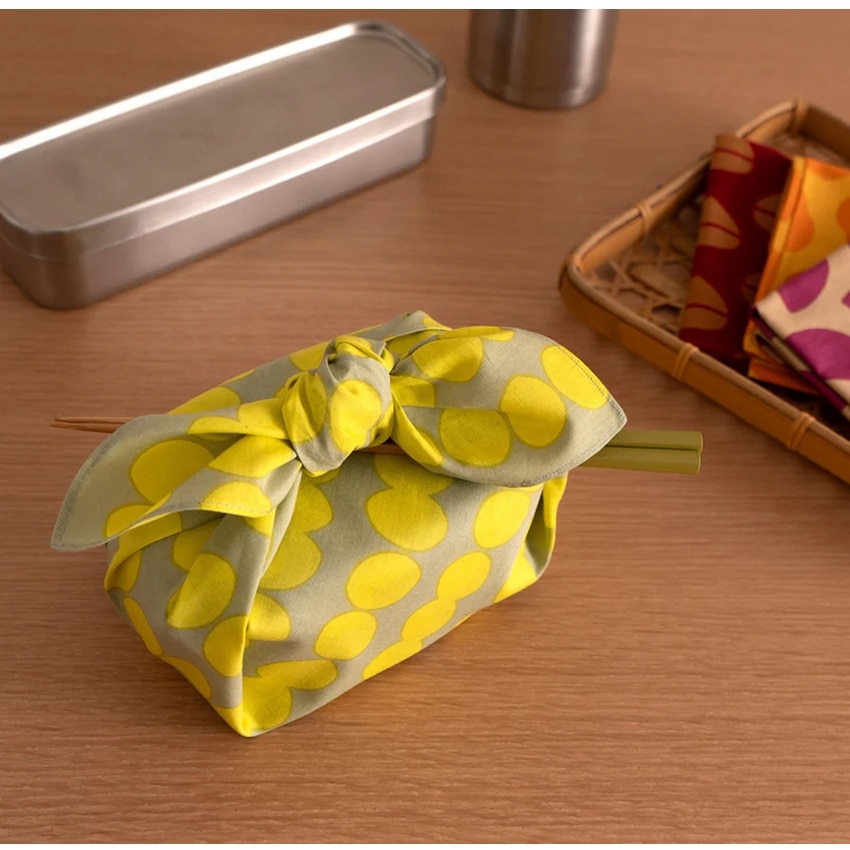 お弁当を包むのにちょうど良い約50cmの小風呂敷は、薄手で結びやすい綿生地に、裏表が目立ちにくい染め方でプリントしています。