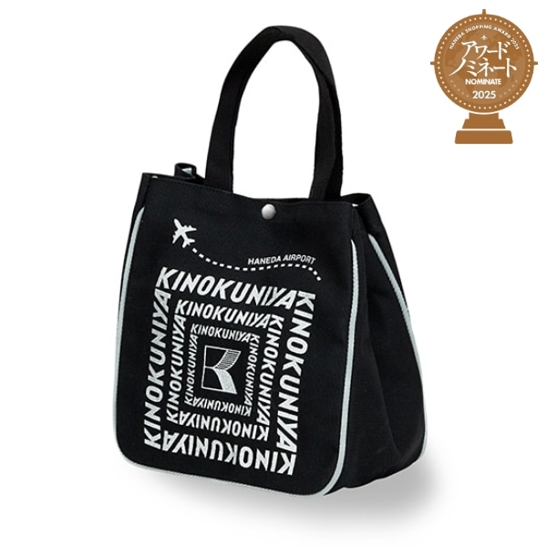 シルバーグレーの紀ノ国屋ロゴとパイピング(内・外)がブラックに映えるコットンバッグ。