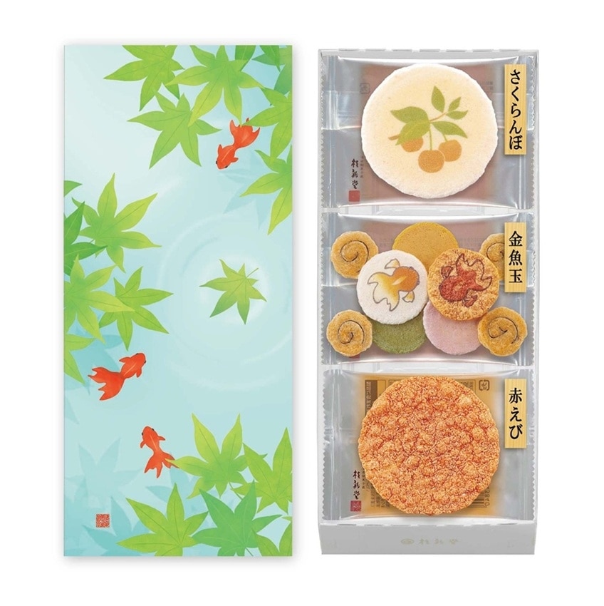 青紅葉や藤の花など、初夏の情景をお楽しみいただける季節限定のえびせんべいの詰め合わせです。