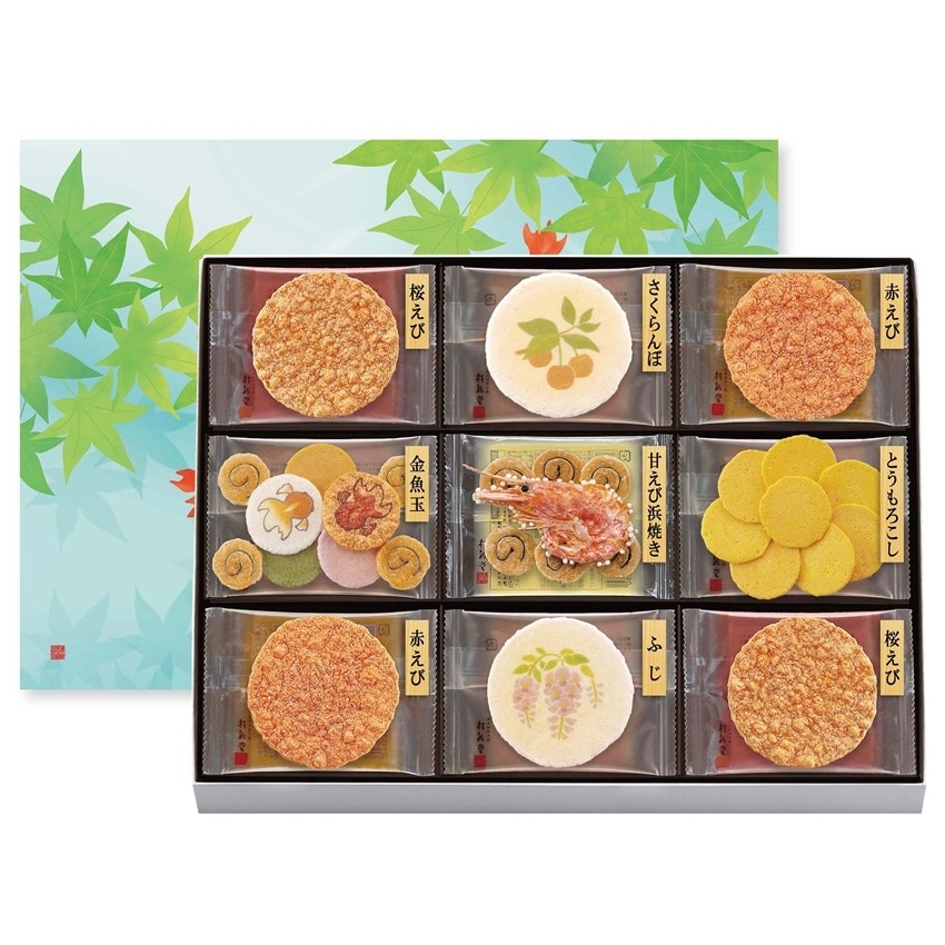 青紅葉や藤の花など、初夏の情景をお楽しみいただける季節限定のえびせんべいの詰め合わせです。